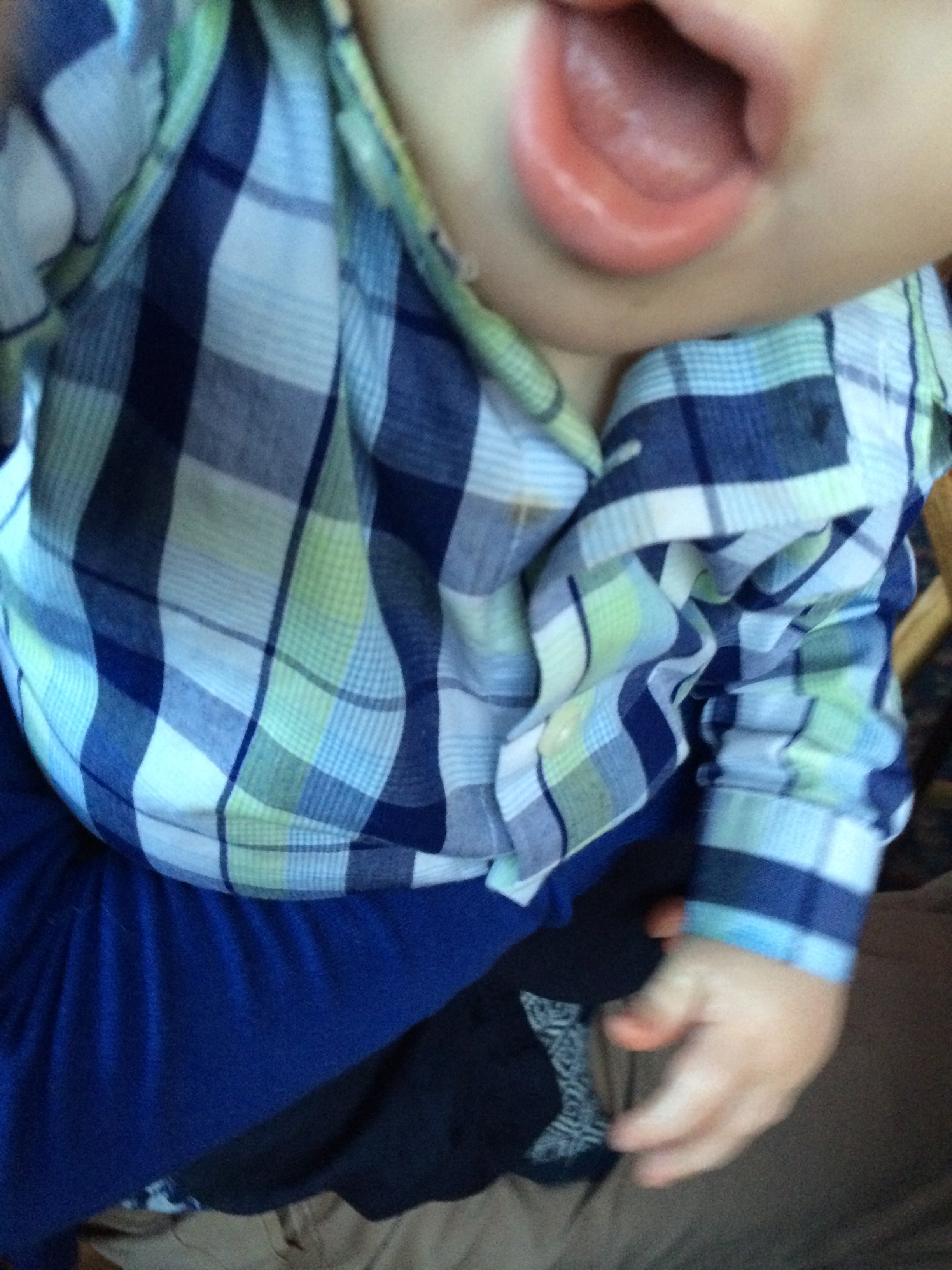 My next day off was Saturday. I’d been wanting to check out this kid-friendly coffee and food place near us called Café au Play, so after having lunch with a friend we went there for coffee and Ari played with another baby – well, they just took toys away from each other over and over. This is the only picture I got – Ari had been standing up at the train tracks and he fell down right as I snapped the photo!