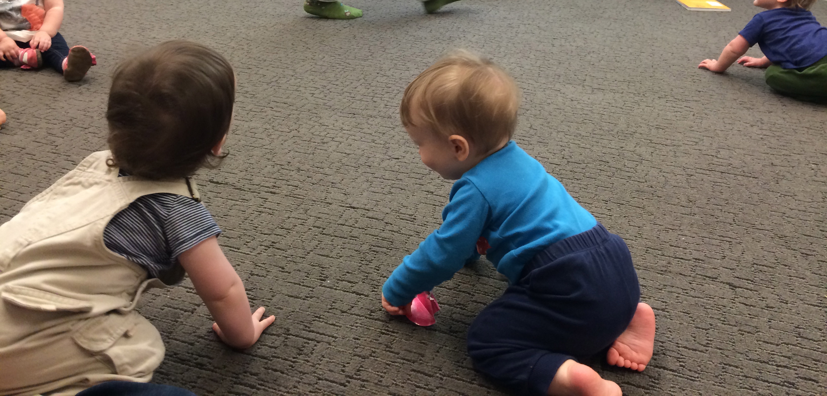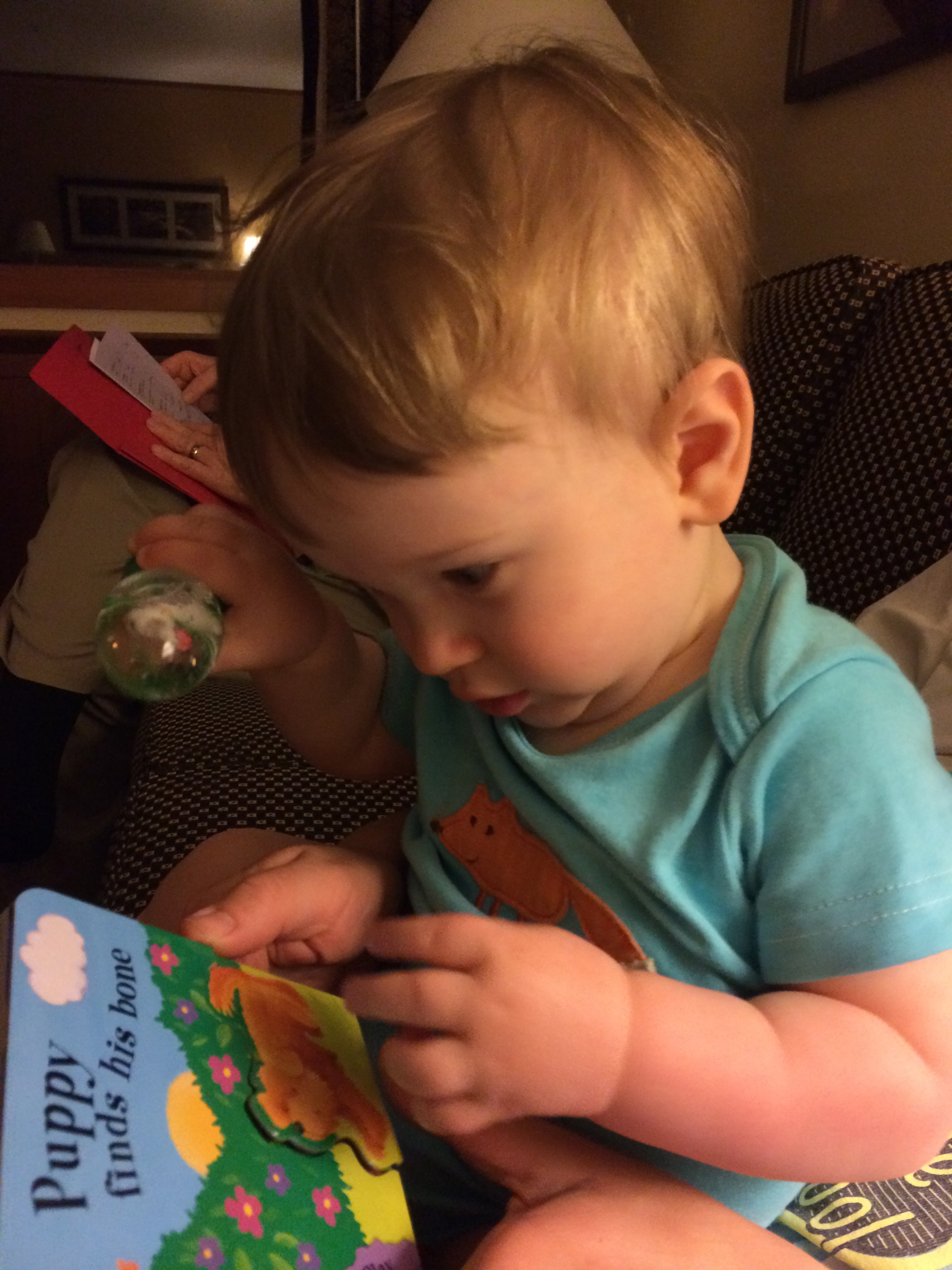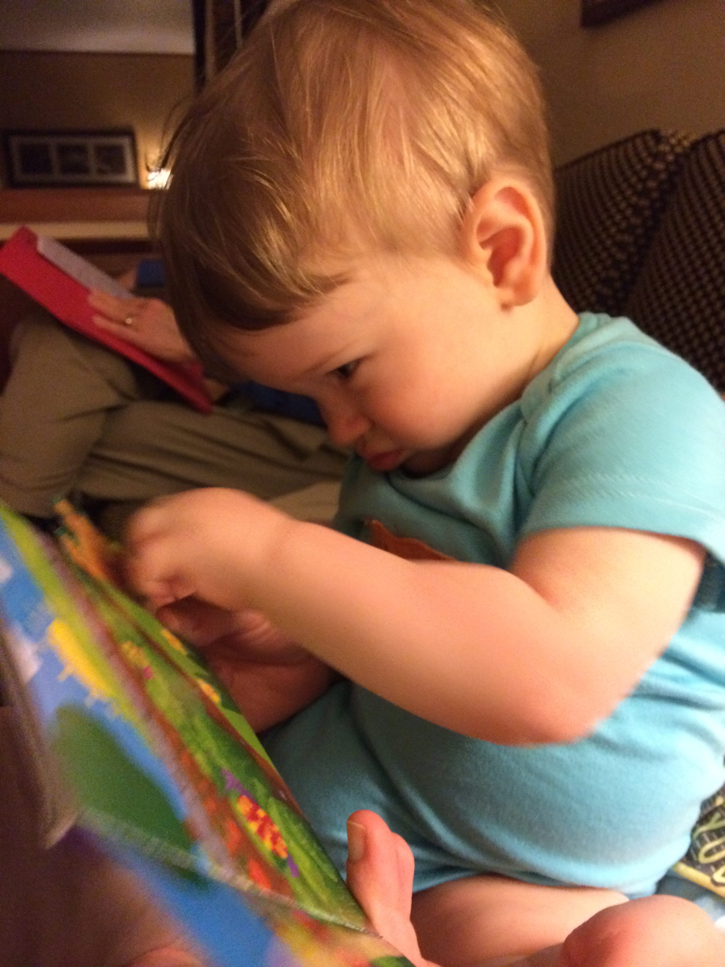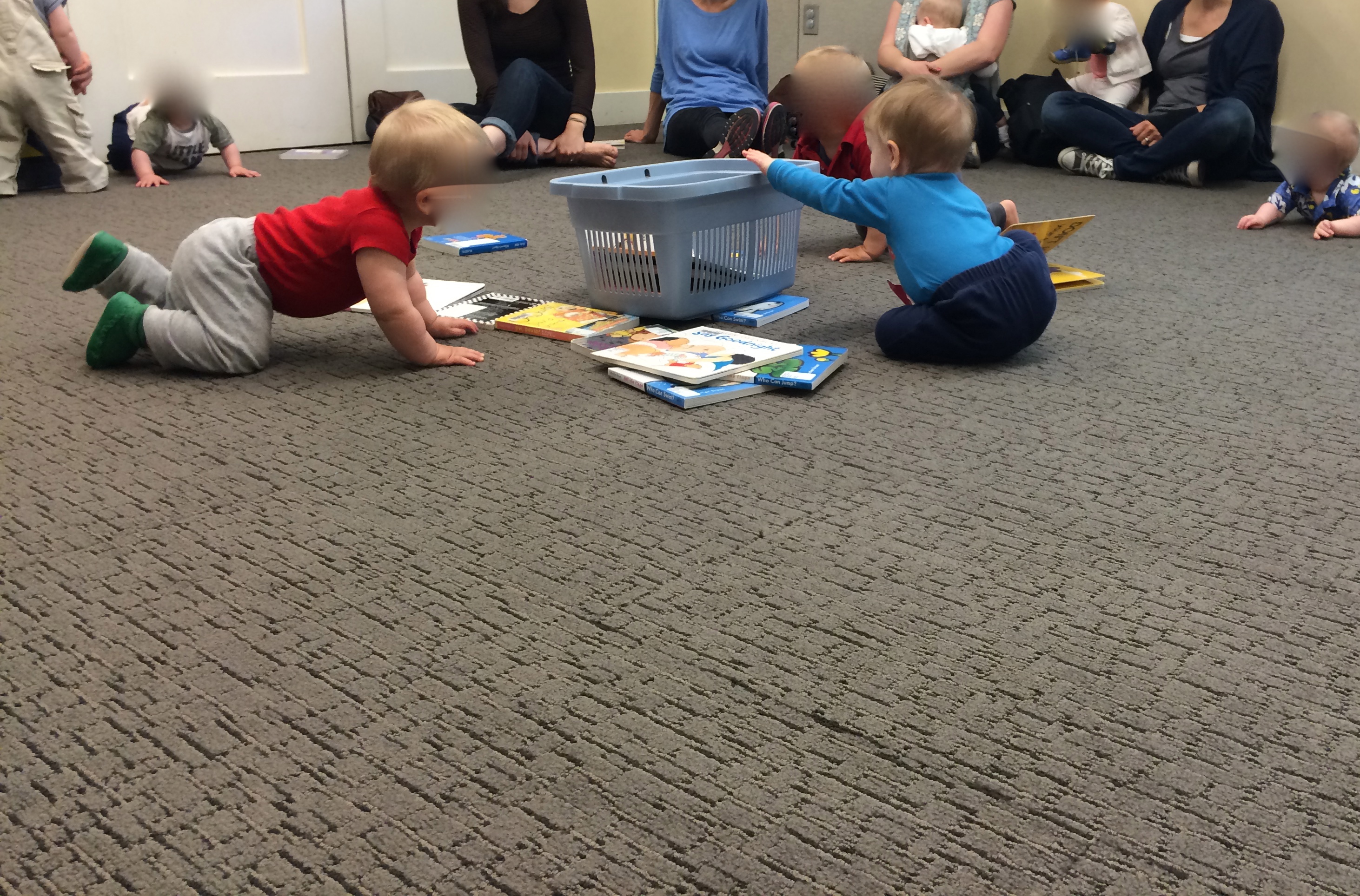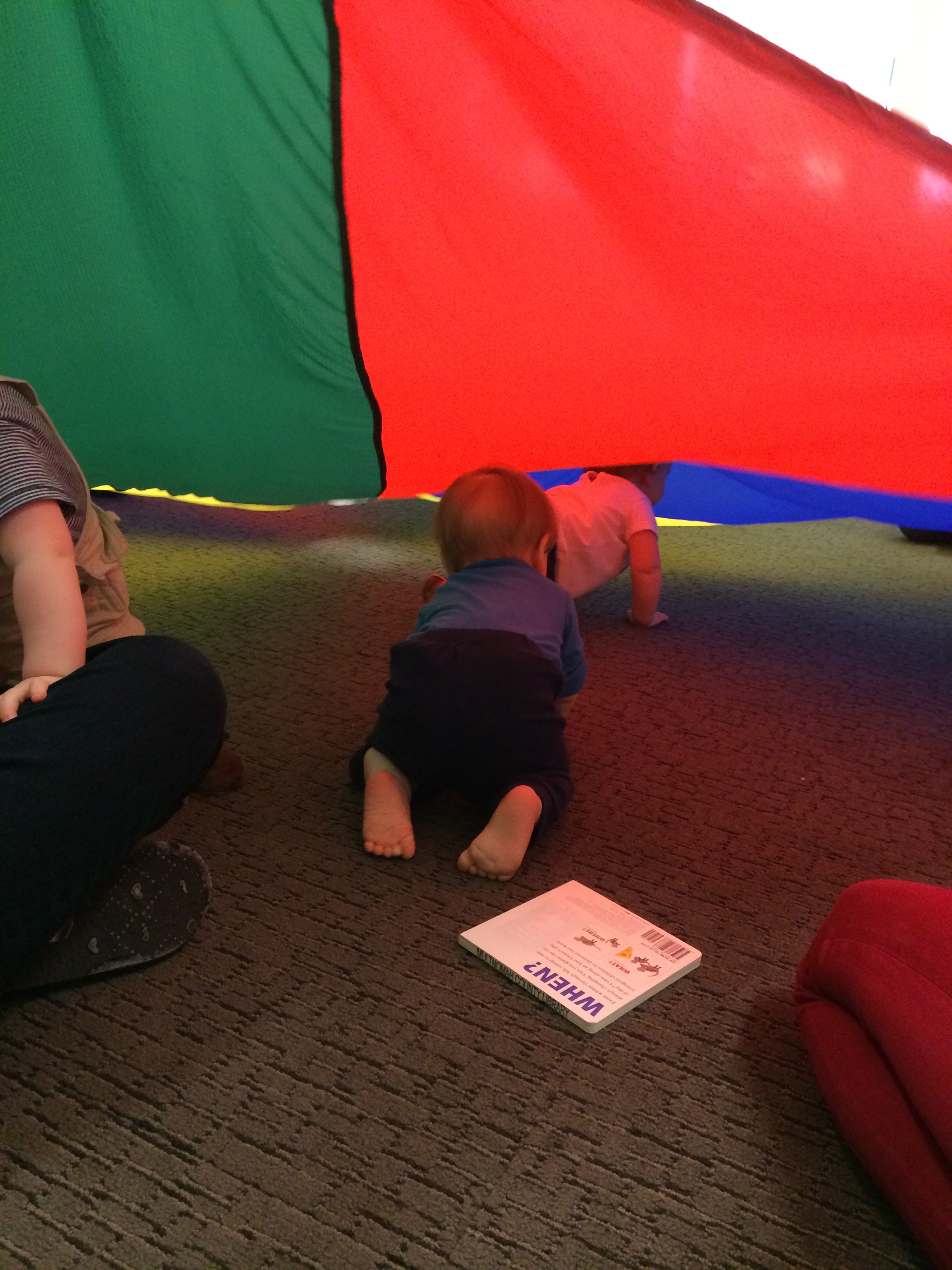 When we got back into town this morning, we went straight to the library half an hour early for Book Babies, because I’m sick of missing it because the room is at capacity when we get there! Ari looked at books in the children’s area before we went in.