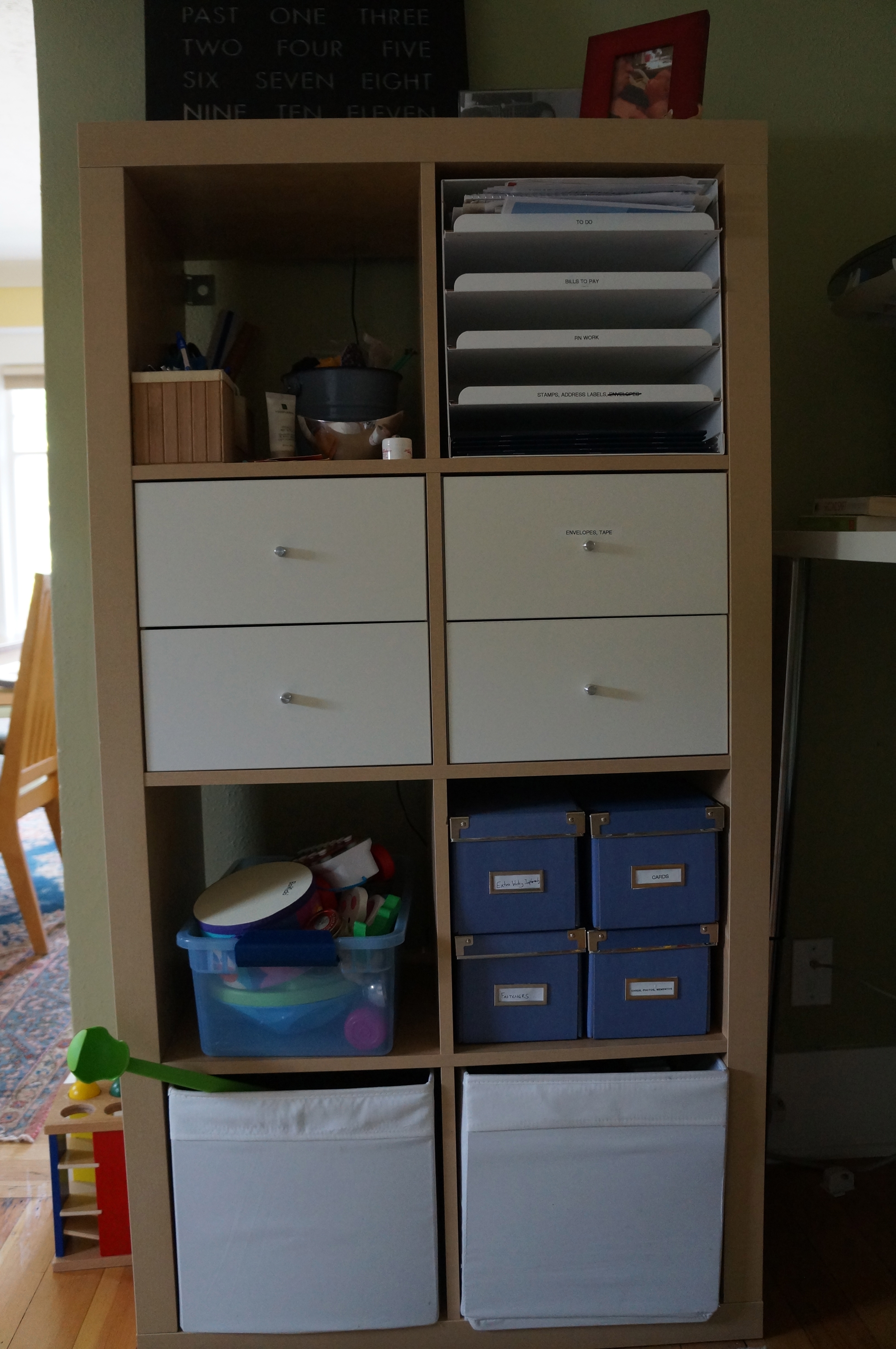 Dog toys on the bottom left and an “Ikea hack” filing cabinet on the bottom right. I believe that now Ikea has finally made a filing bin that fits the Expedit, though.