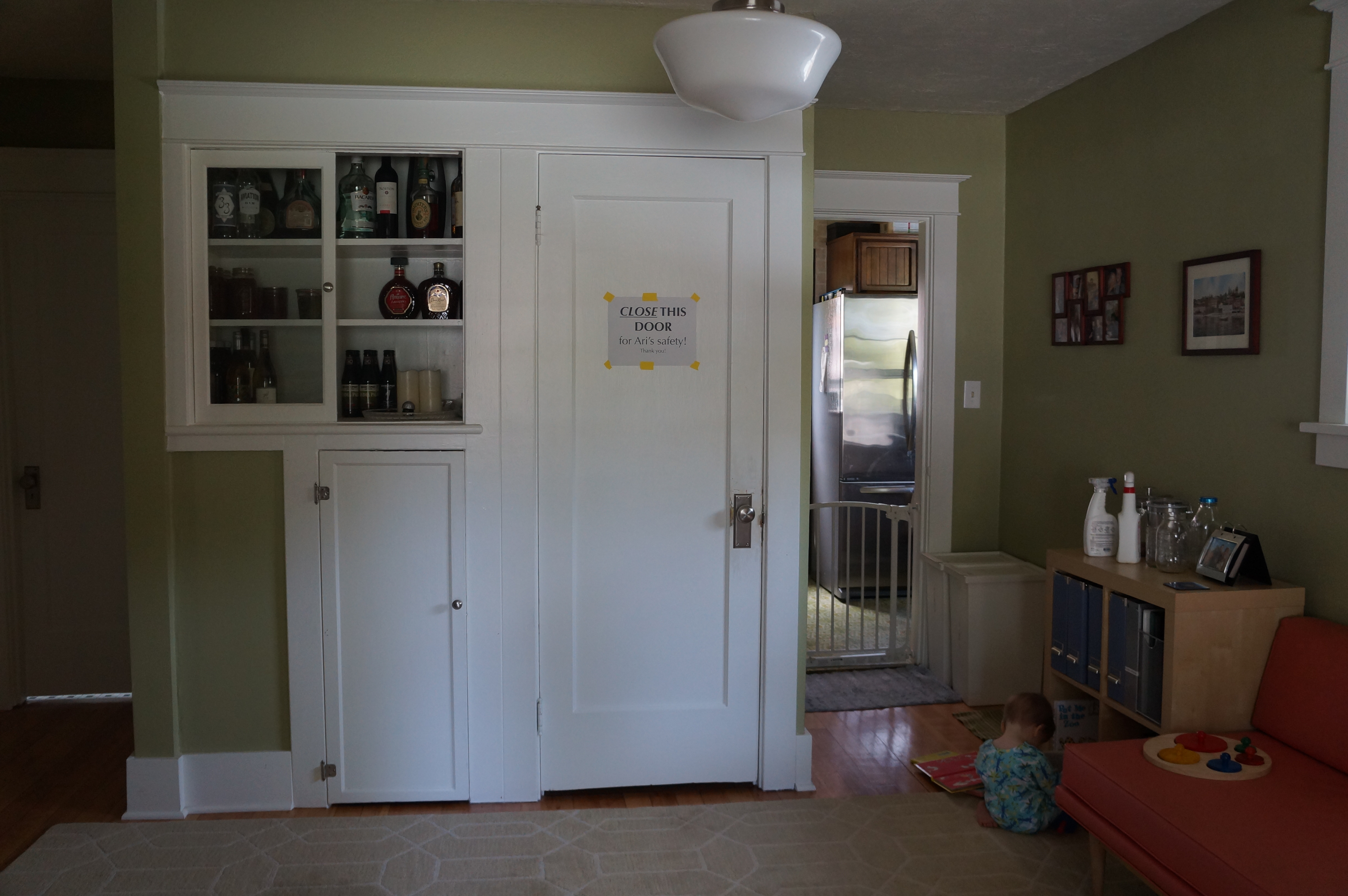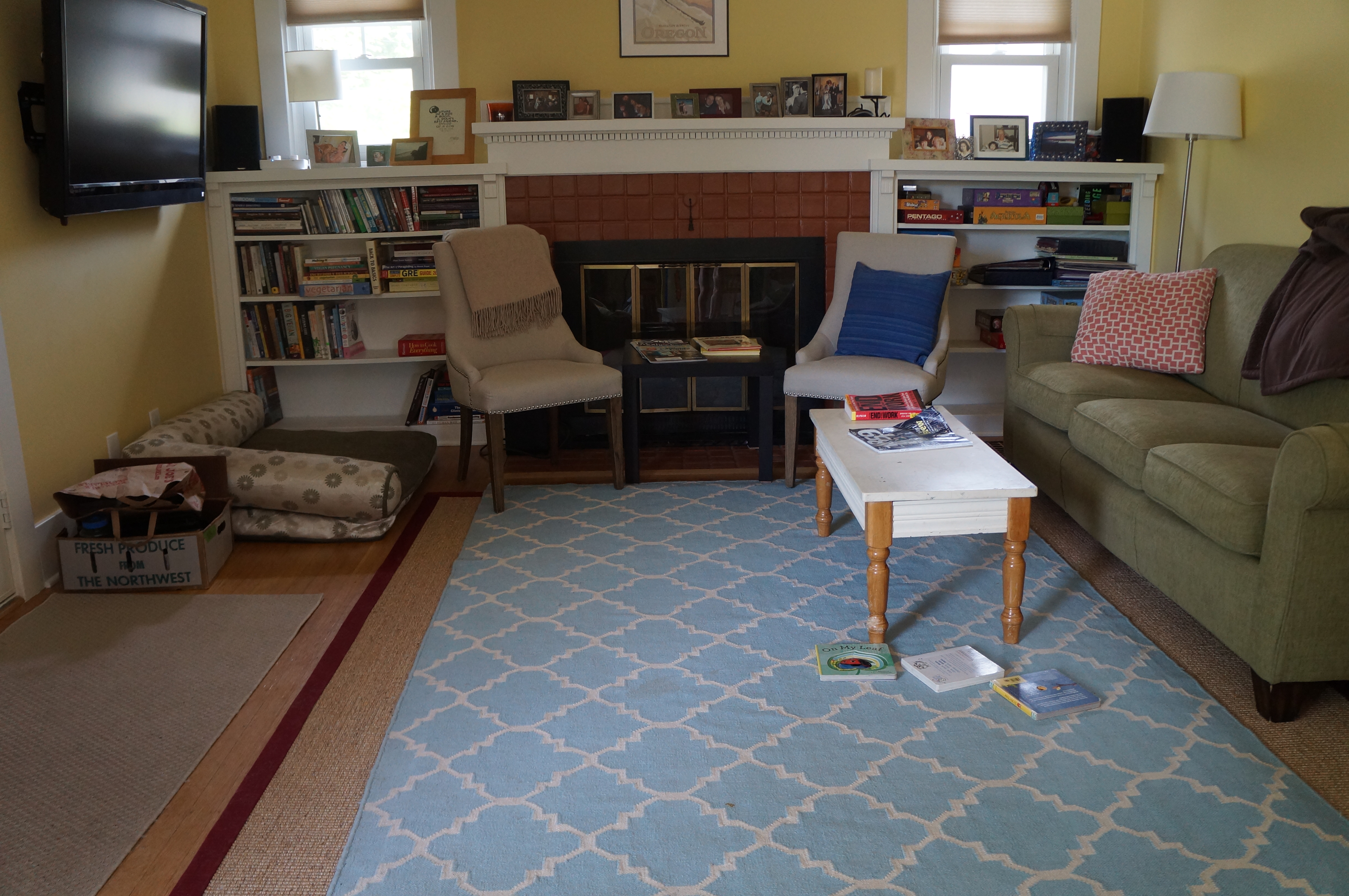 Ari demonstrating his bookshelf…recycling bins far left. Sometimes we put the dog’s bowls on the green rug, but not when Ari is up.