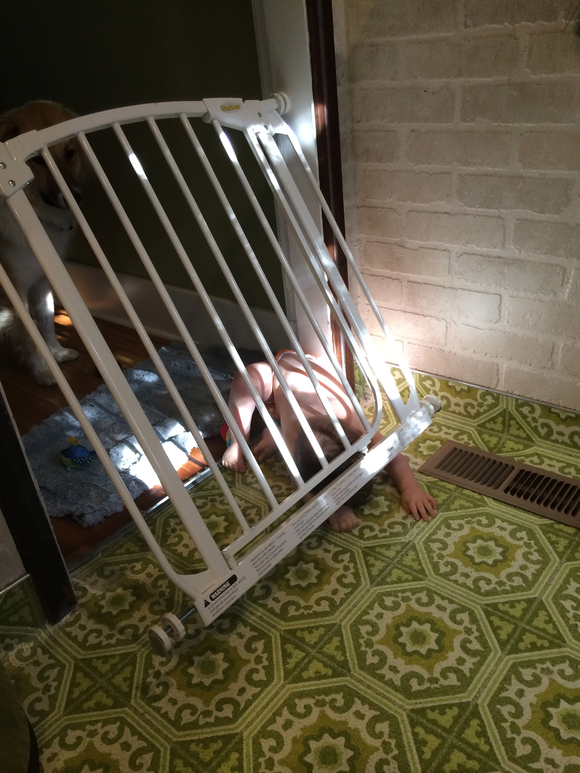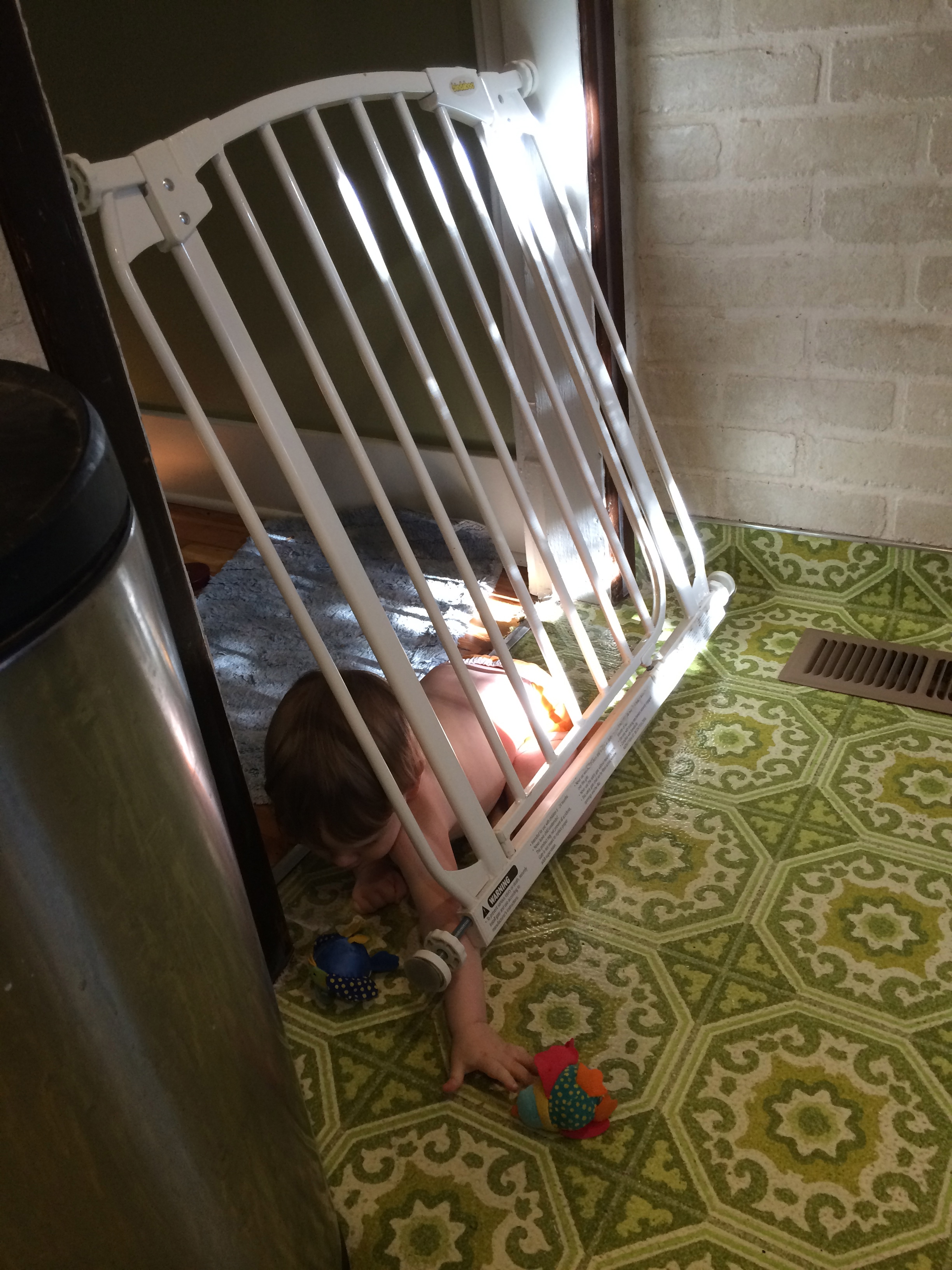 And here he is sneaking into the kitchen – yes, he did eventually get himself stuck and start screaming: