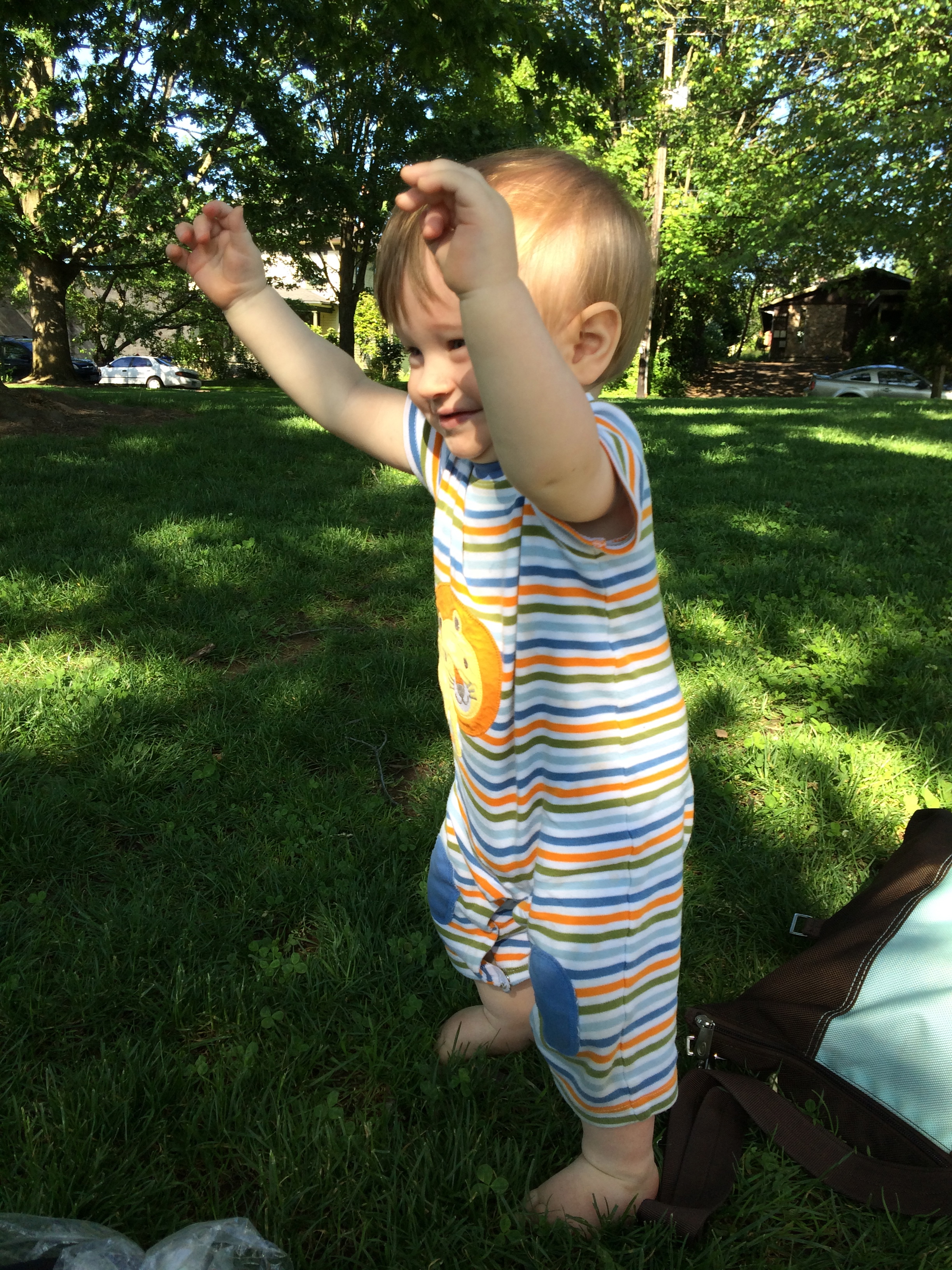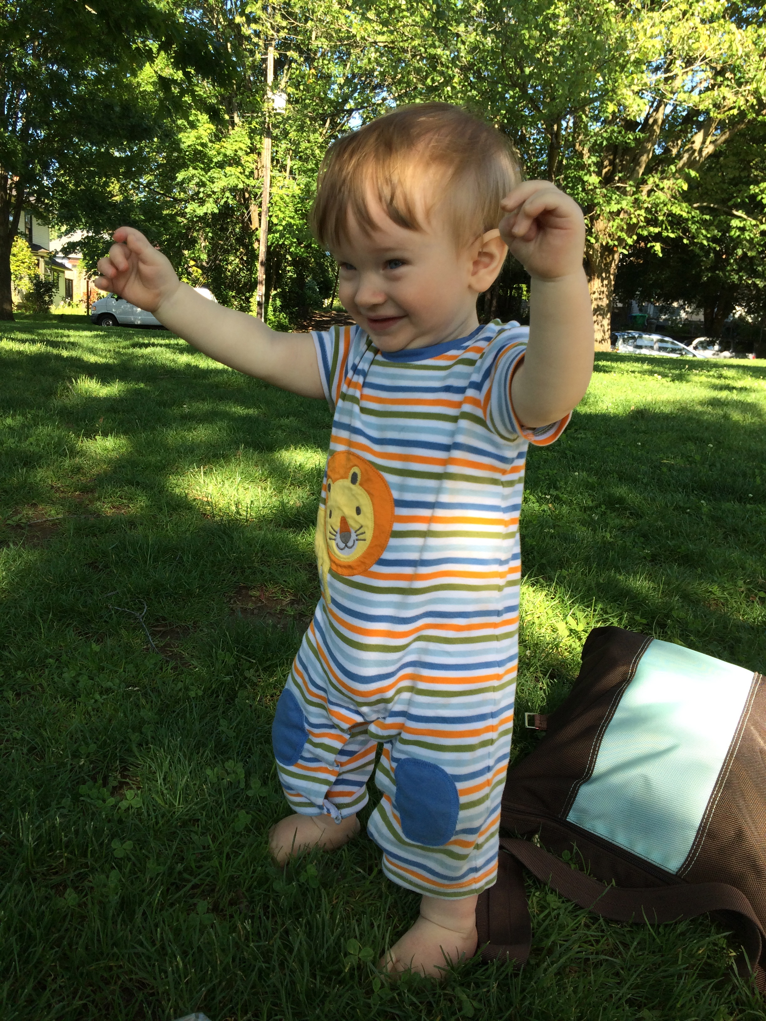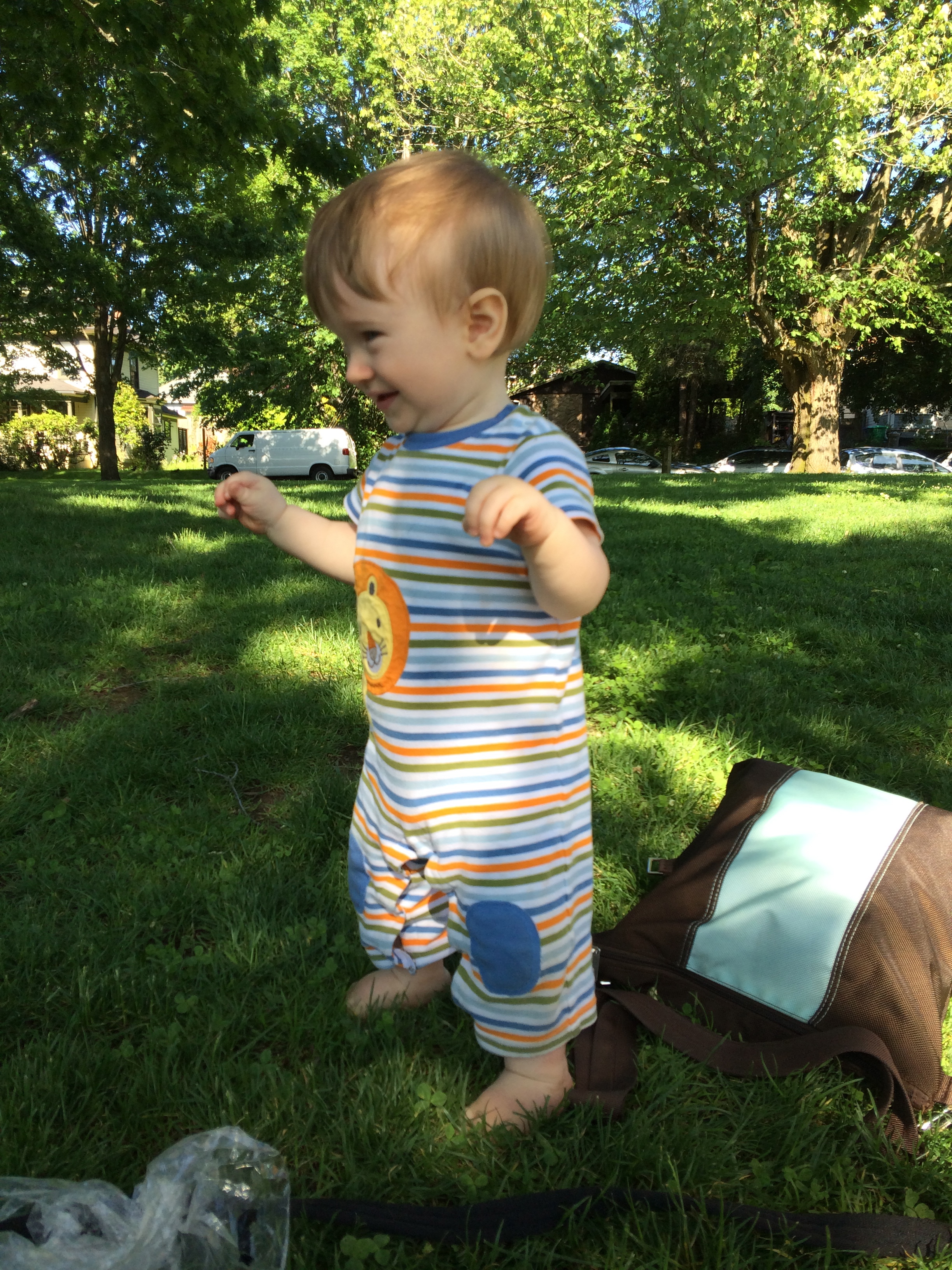 Around the end of May, he was doing more and more standing up by himself, but not taking any steps. Here are some pictures from the park near our house: