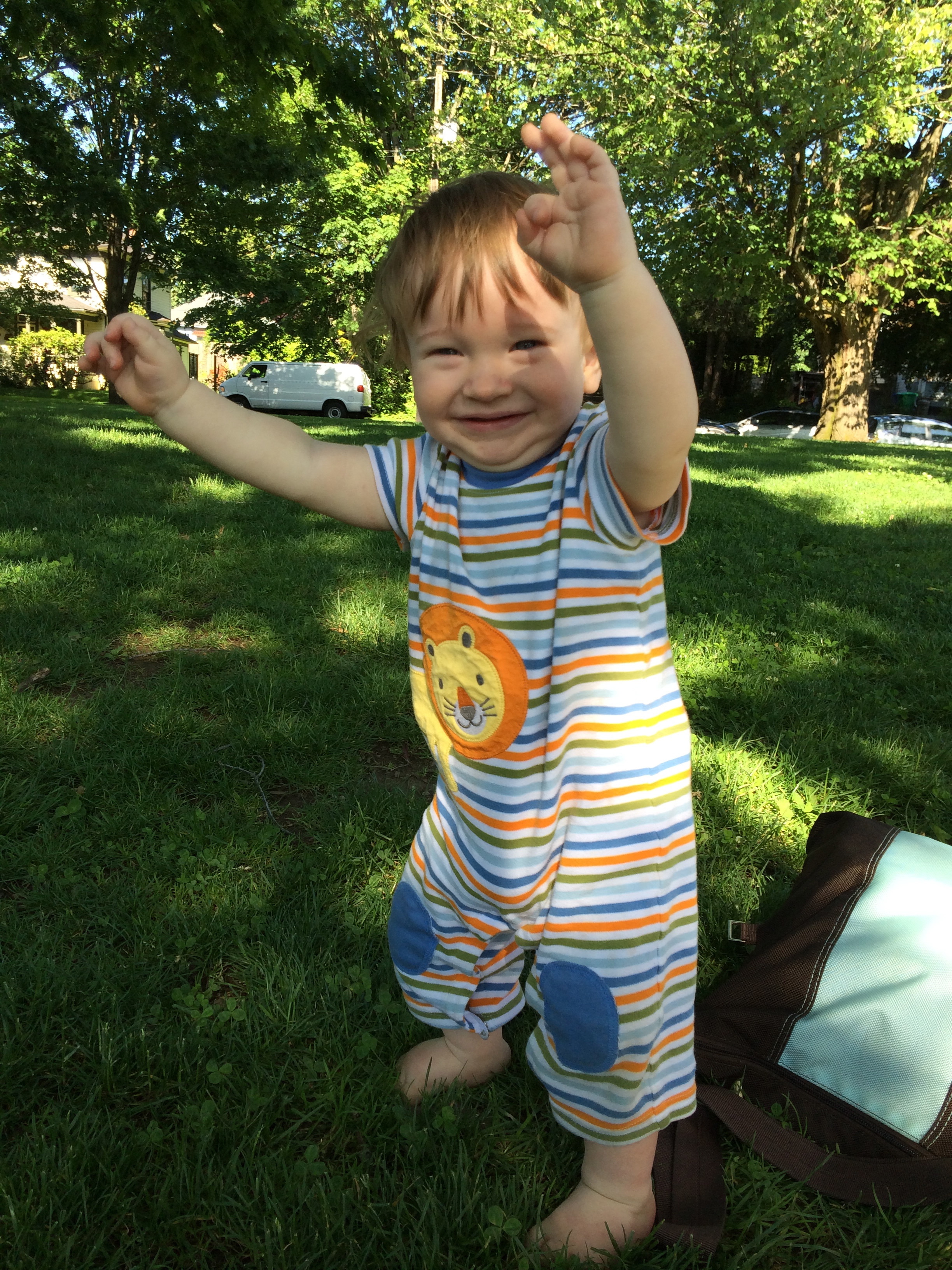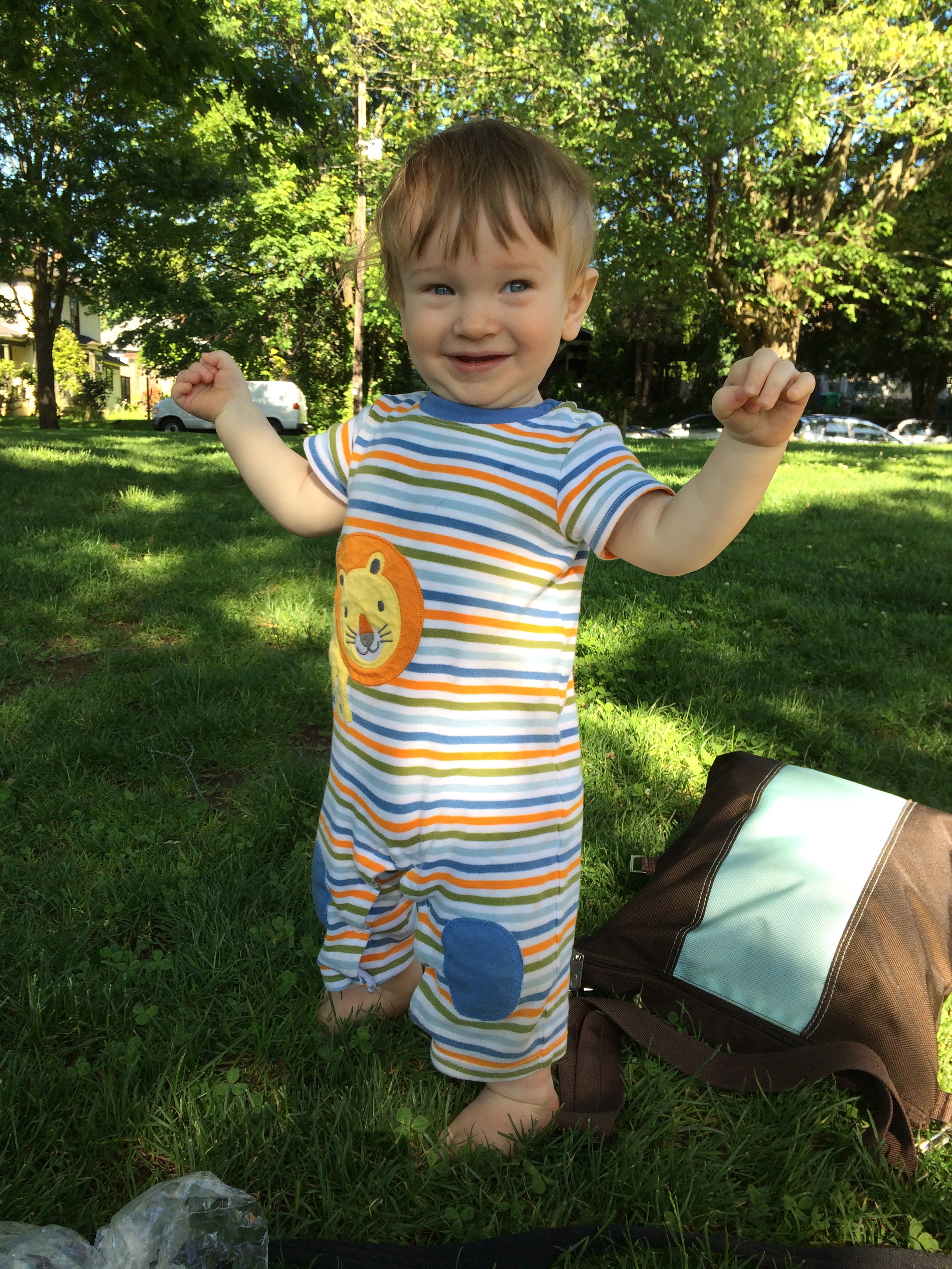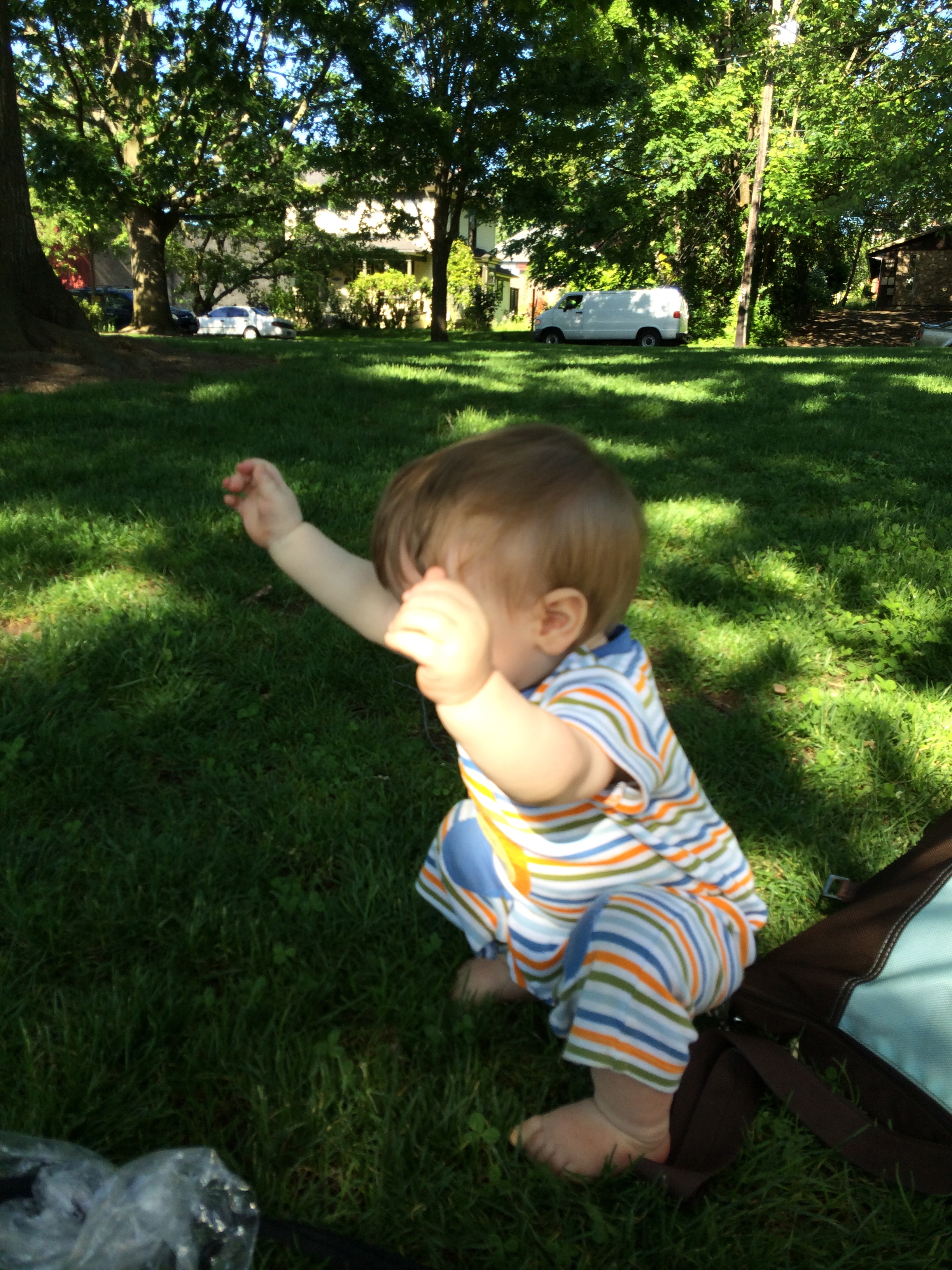 Around the end of May, he was doing more and more standing up by himself, but not taking any steps. Here are some pictures from the park near our house: