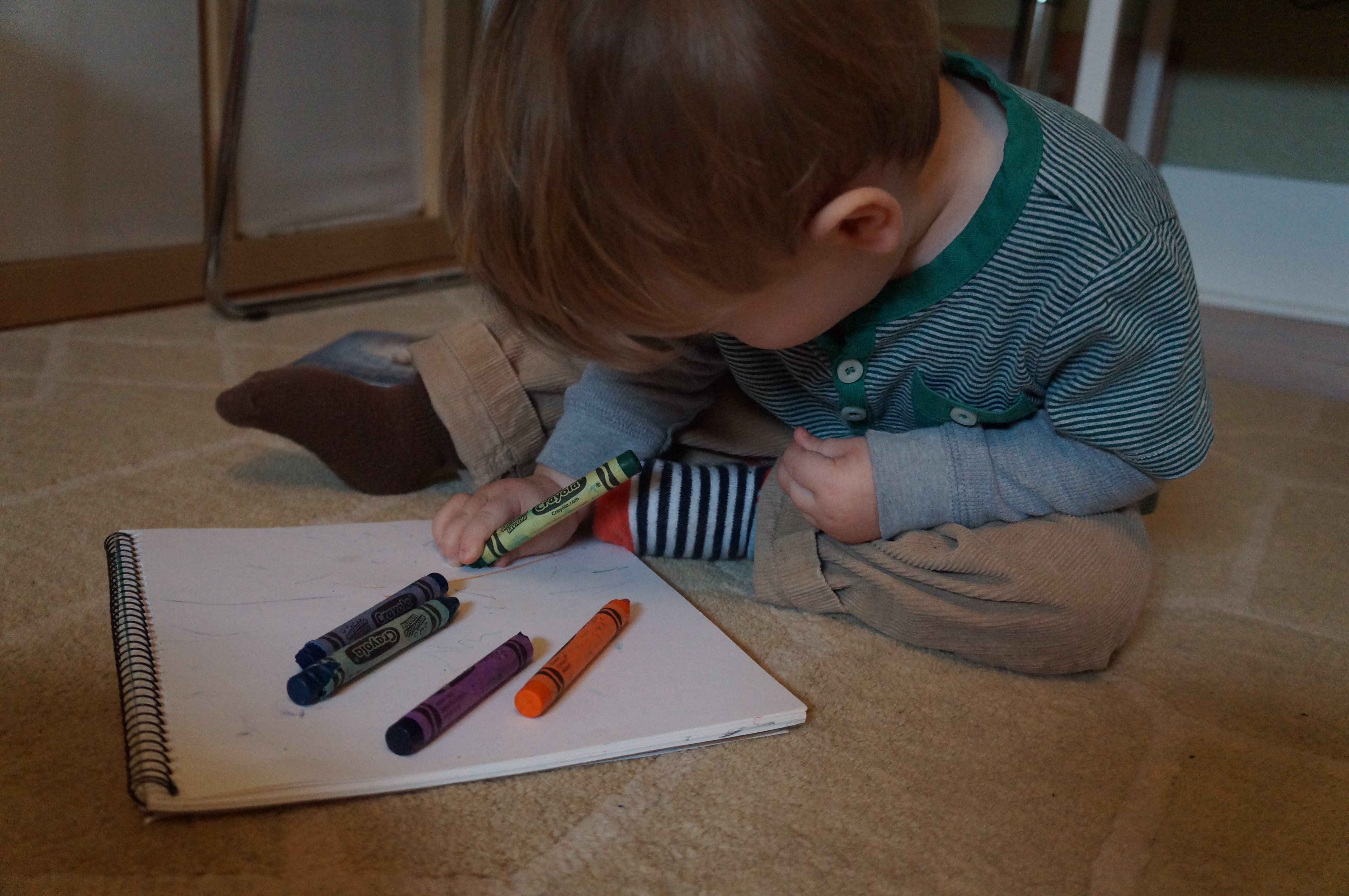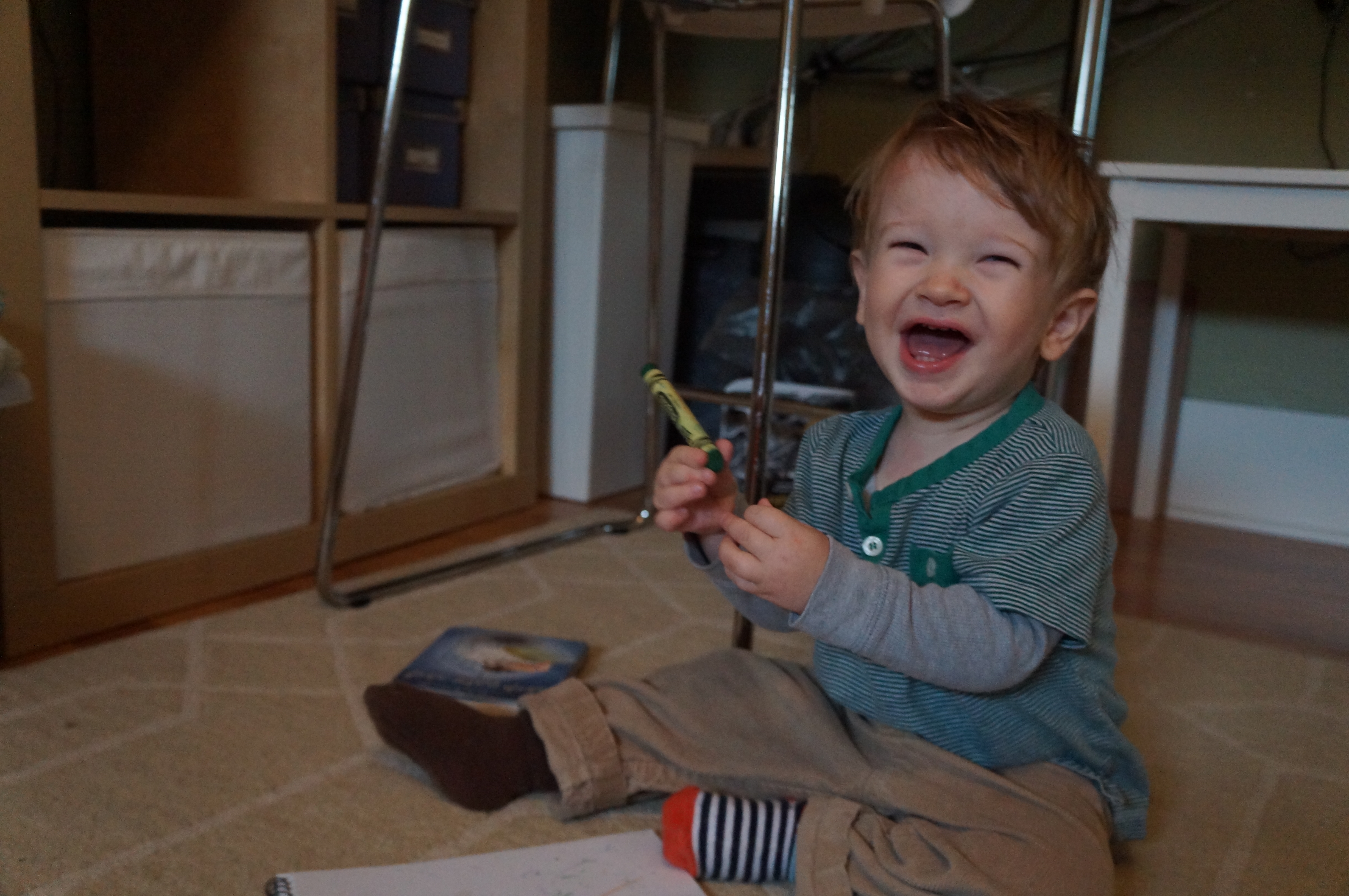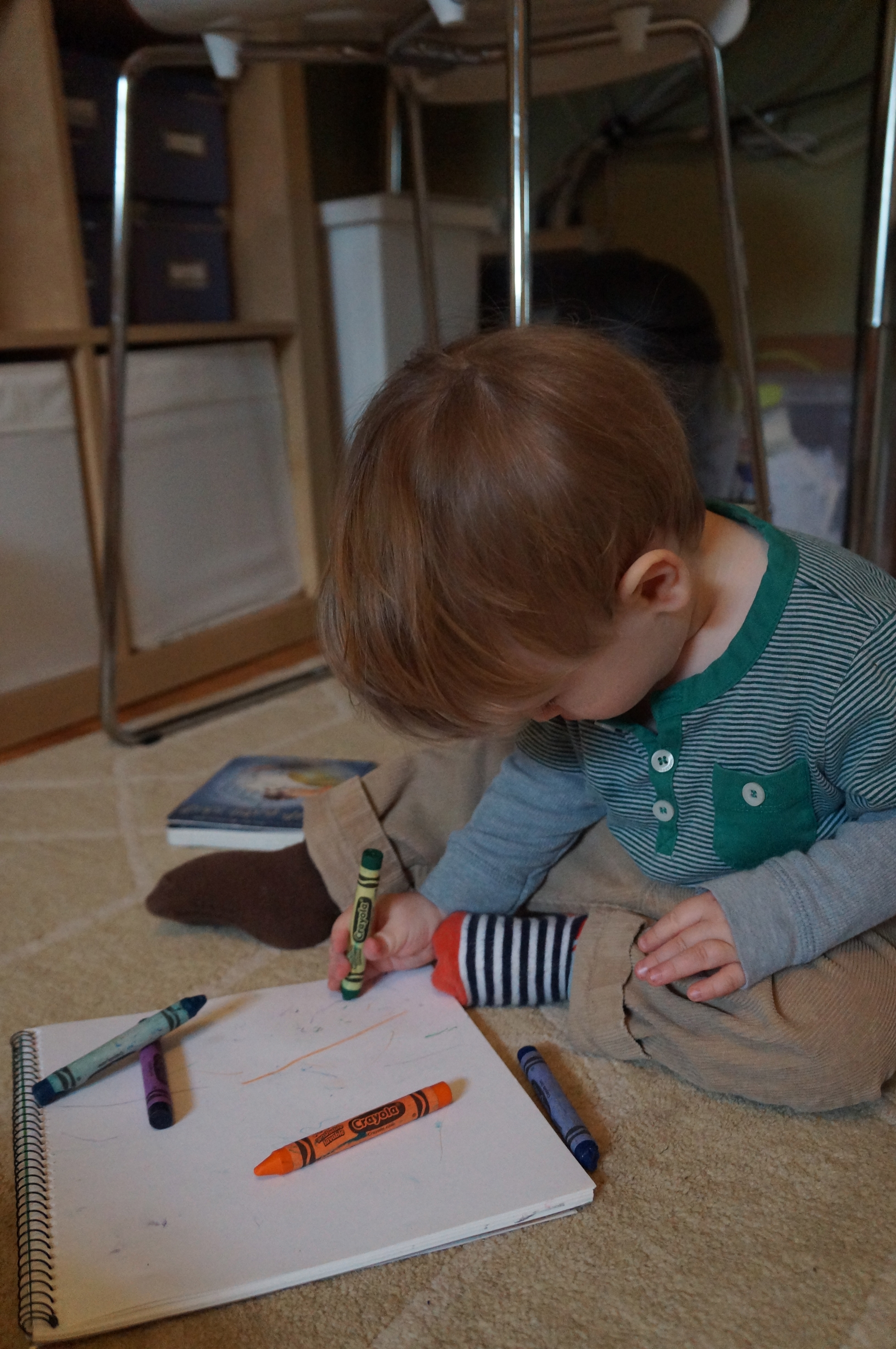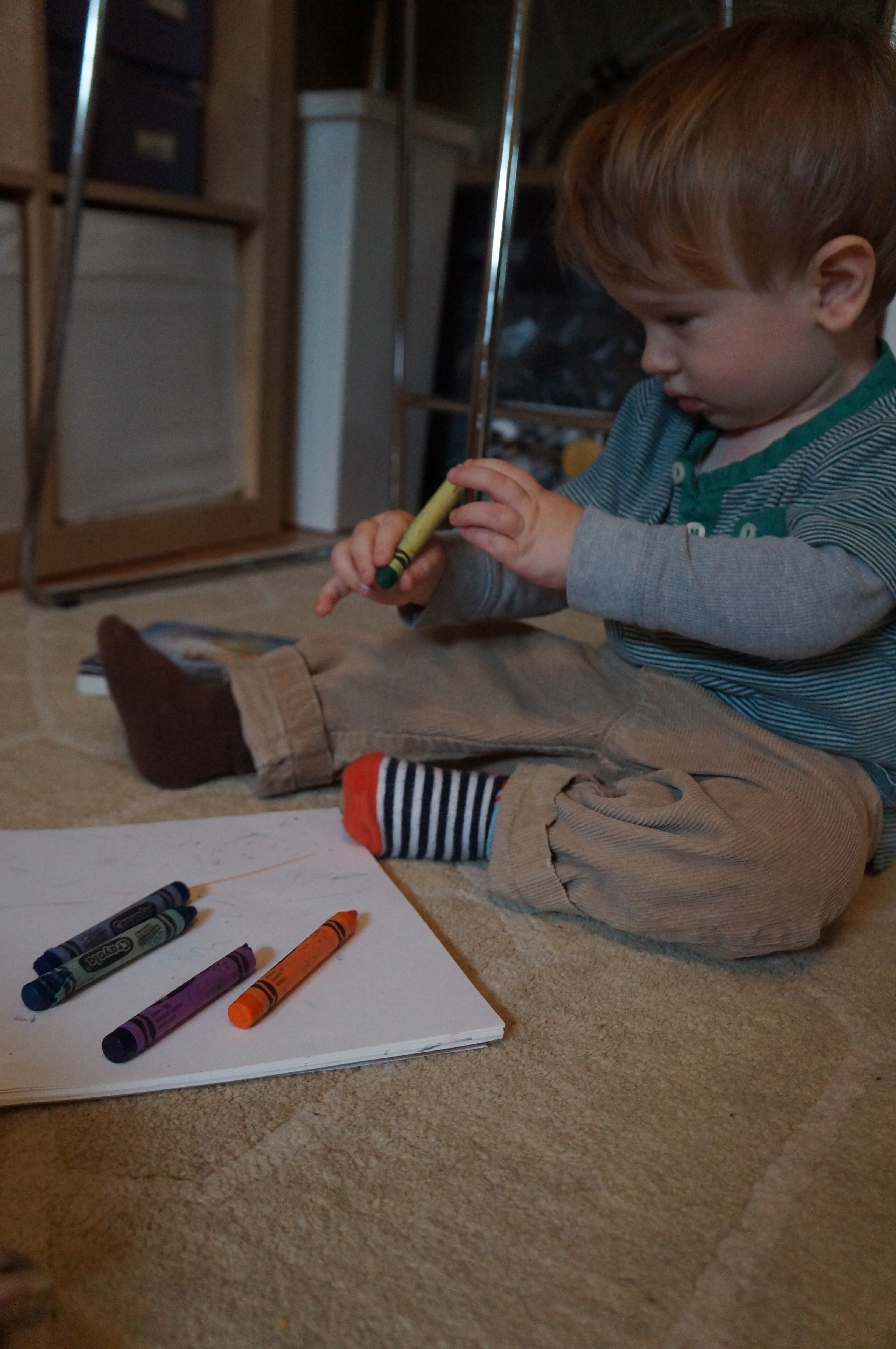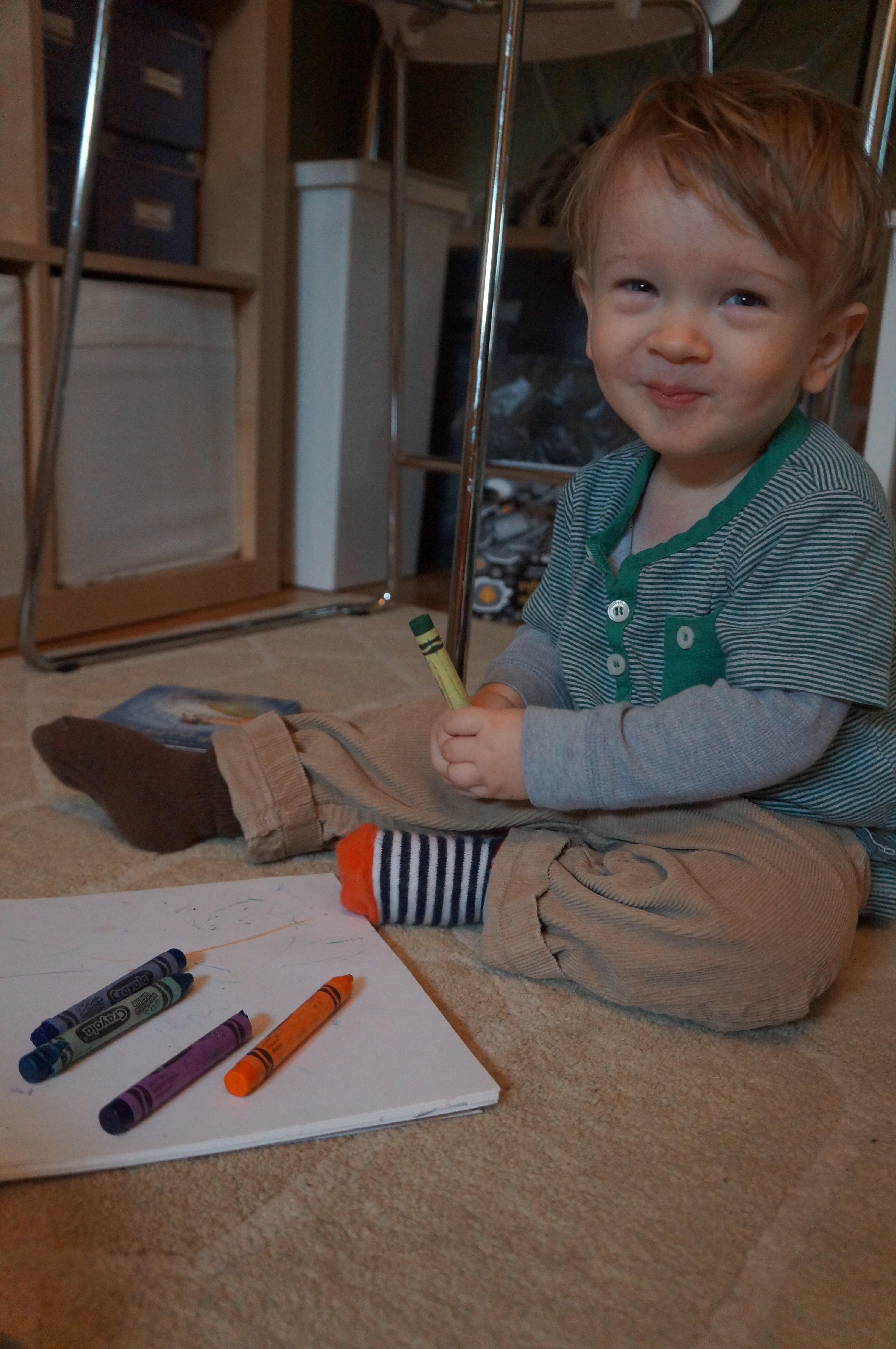 He’s more into putting things into containers, and he seems to understand directions pretty well, too. I can say, “now let’s put the toys back in the basket” and he’ll do it! (Sometimes.)