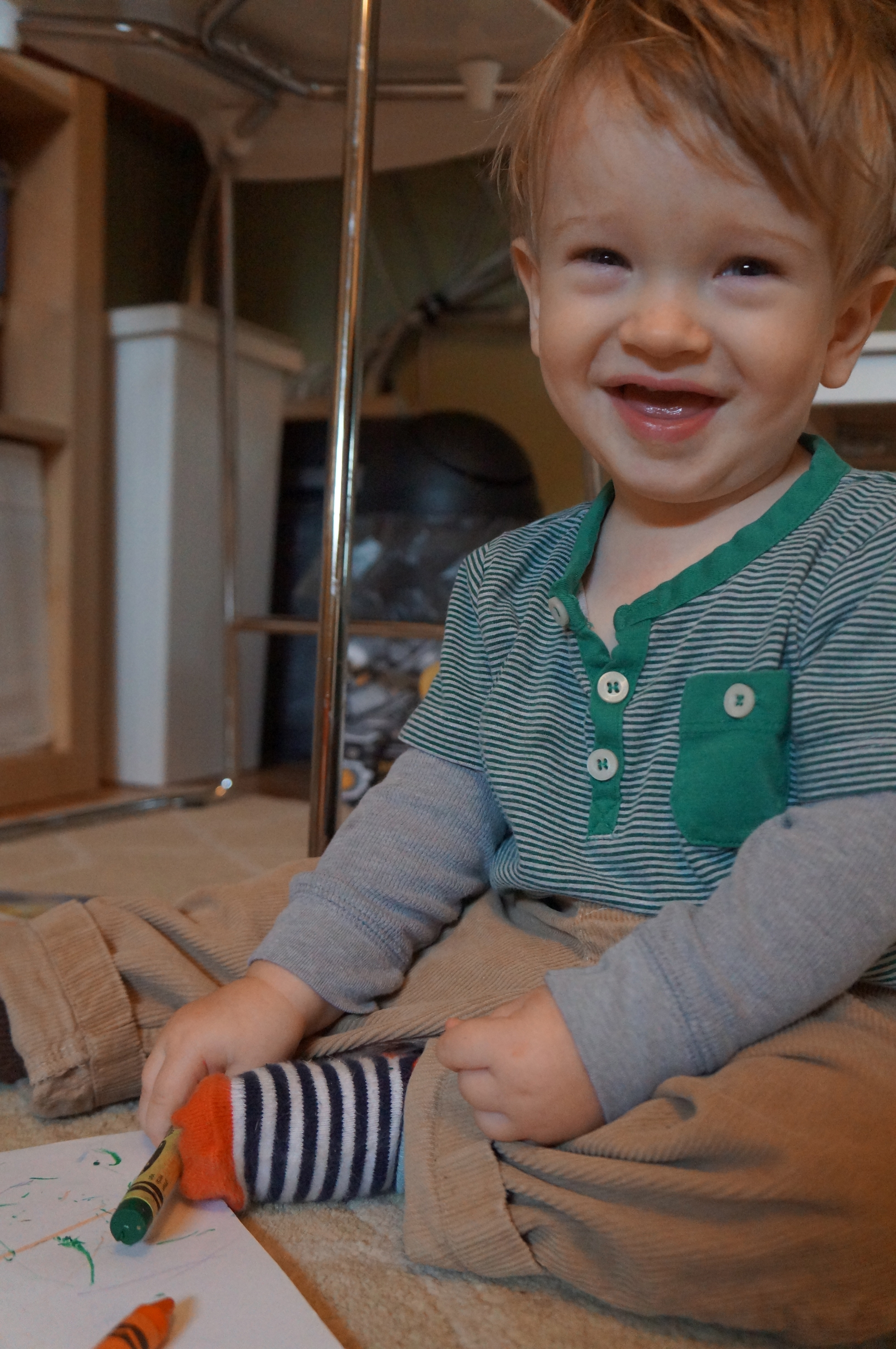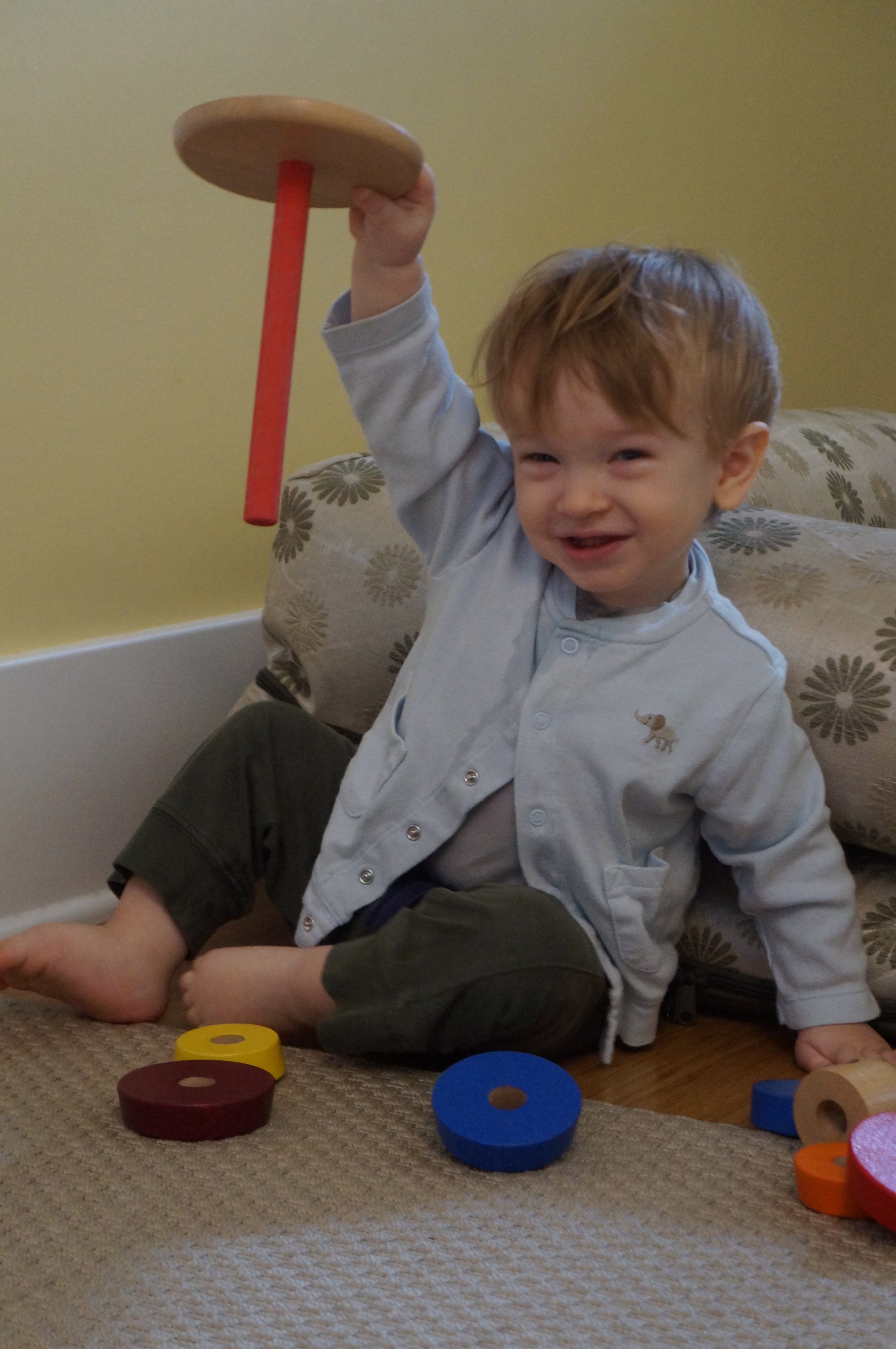 The nanny he had the other day said he was enjoying his ring stacking toy so I got that out yesterday and he spent HOURS working on it! At first I was doing it with him and he was getting frustrated when he couldn’t get the rings on the pole, then I went to do something else and he just sat there stacking the rings and then tipping it upside down and letting them all slide off OVER AND OVER AND OVER. ALL DAY. That was PERFECT because A. and I were not feeling well – A. was home sick actually – and we just wanted to sit around! Truly an unusual day with a toddler.