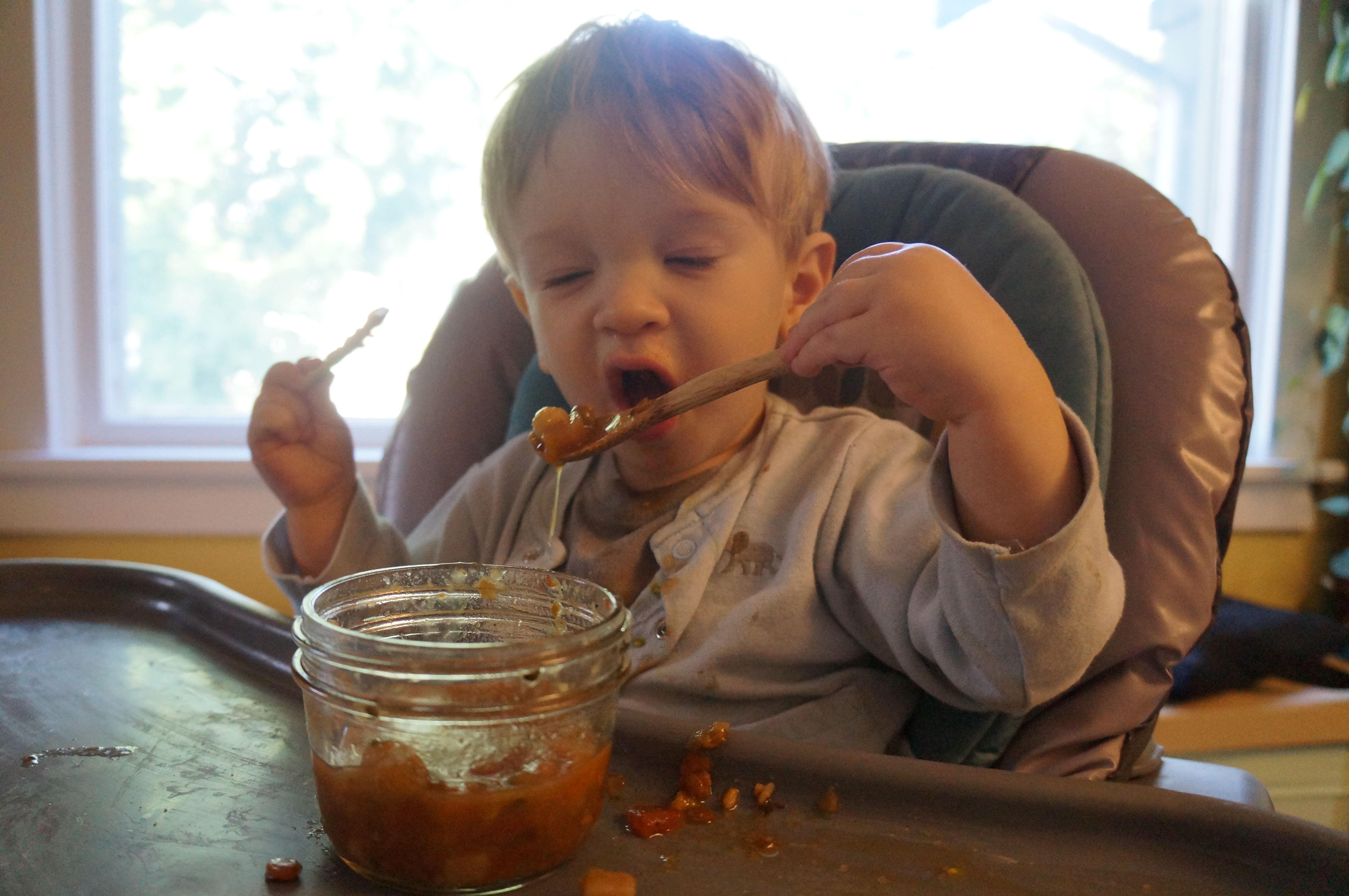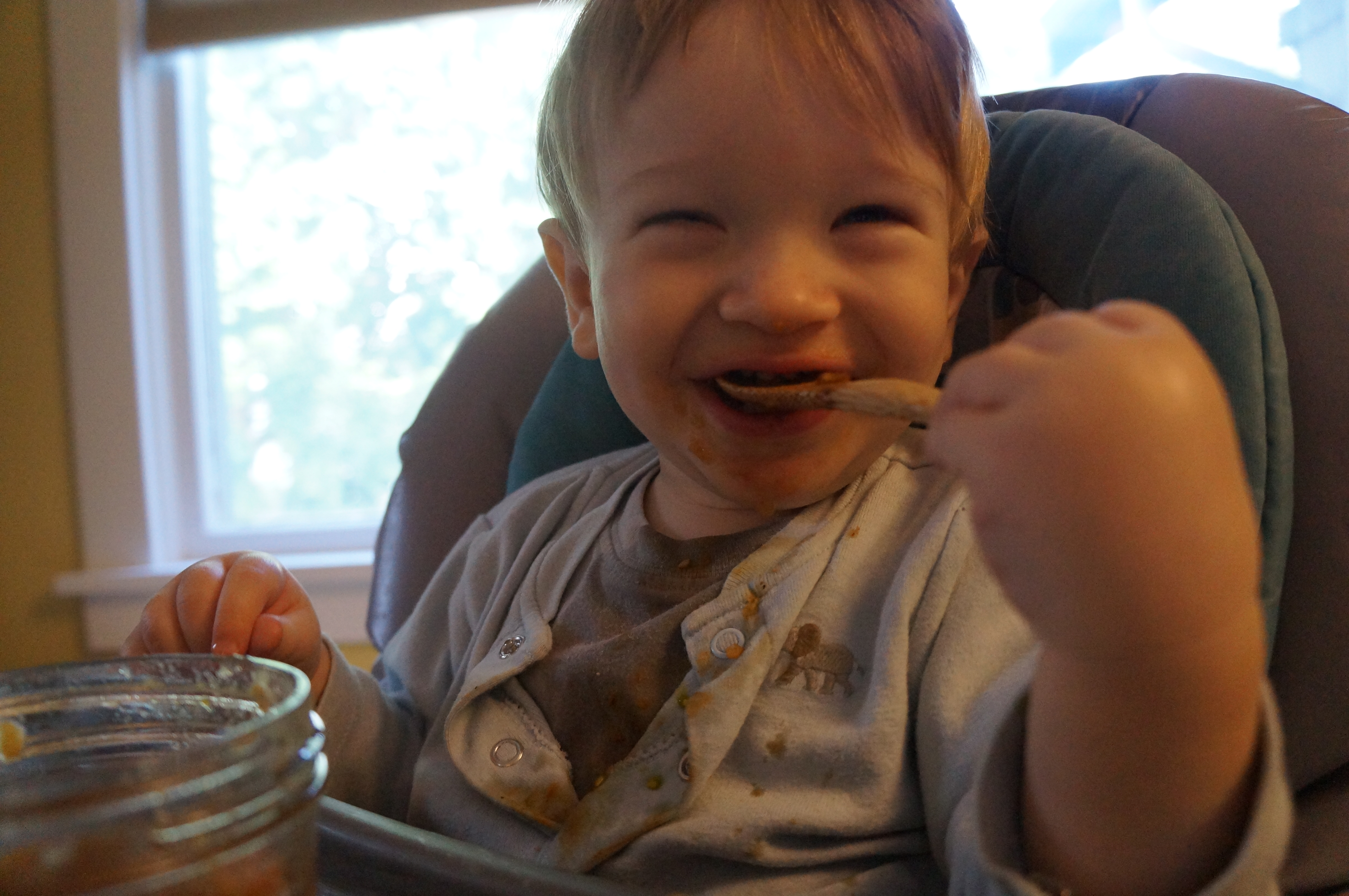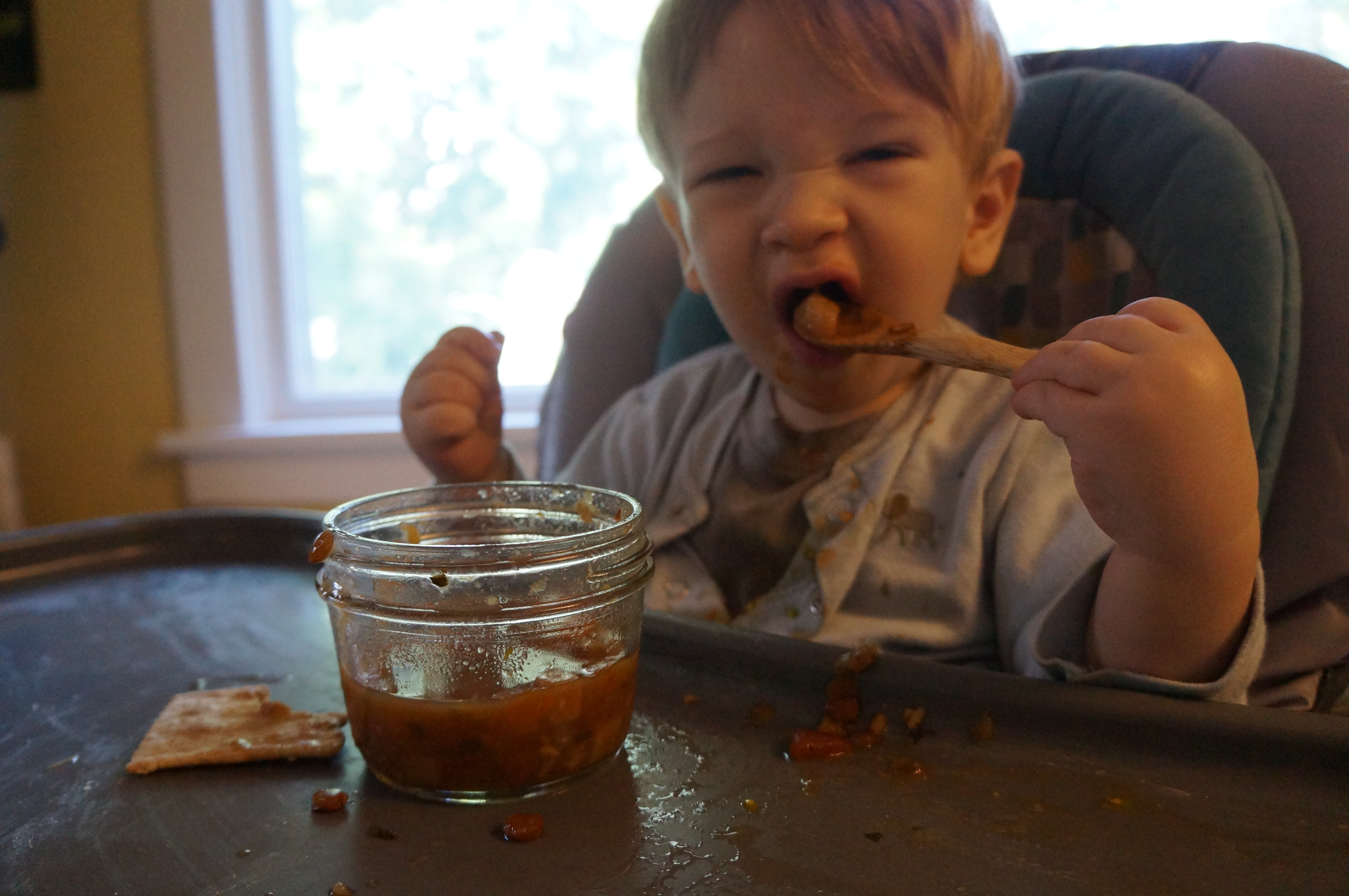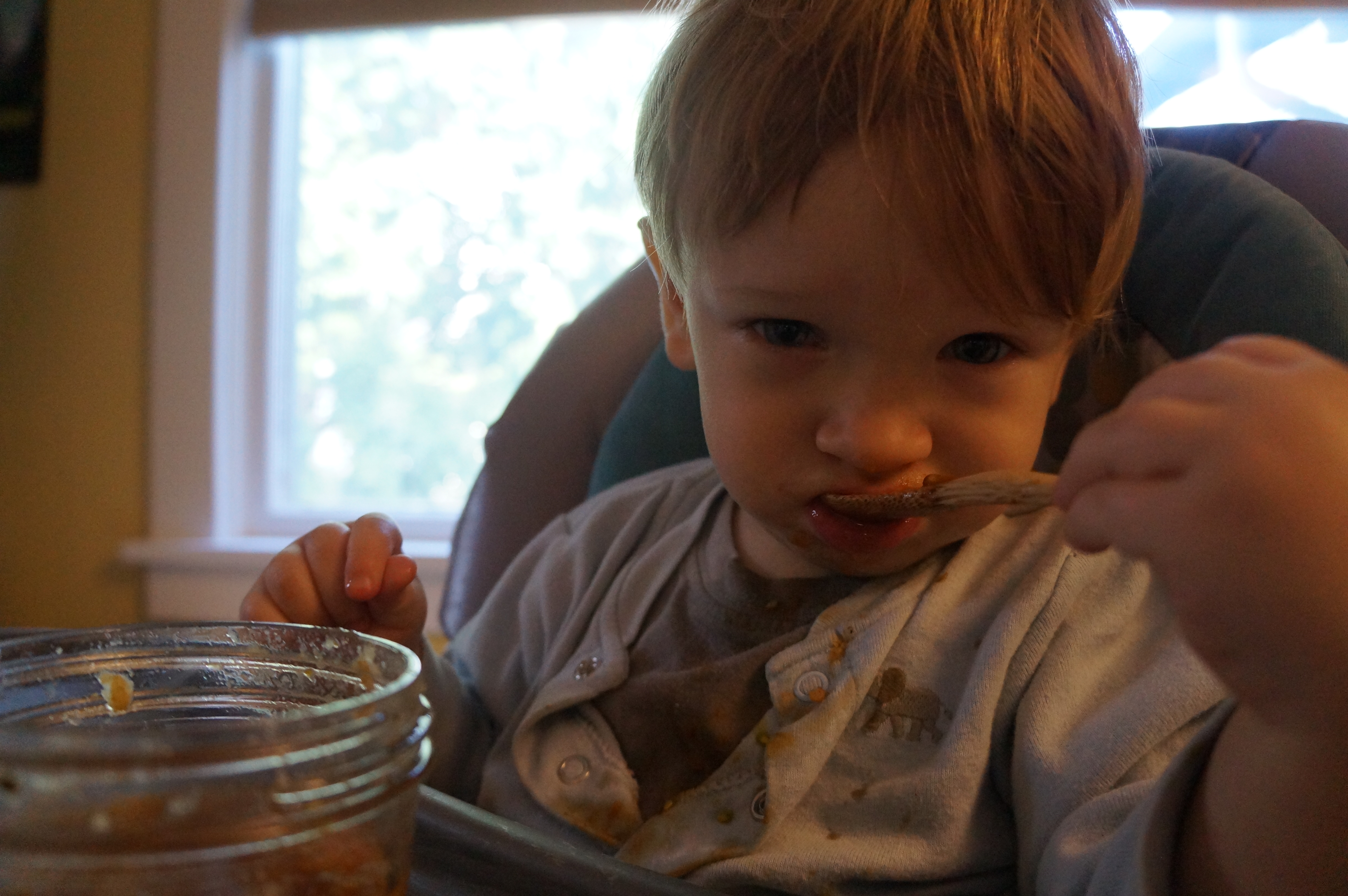 Feeding himself soup – a moment before, he’d had the cracker in his mouth and wanted a bite of soup too, so instead of taking the cracker out he raised the corner of his lip as much as he could and tried to stuff the spoon in there, but it didn’t quite work. 🙂