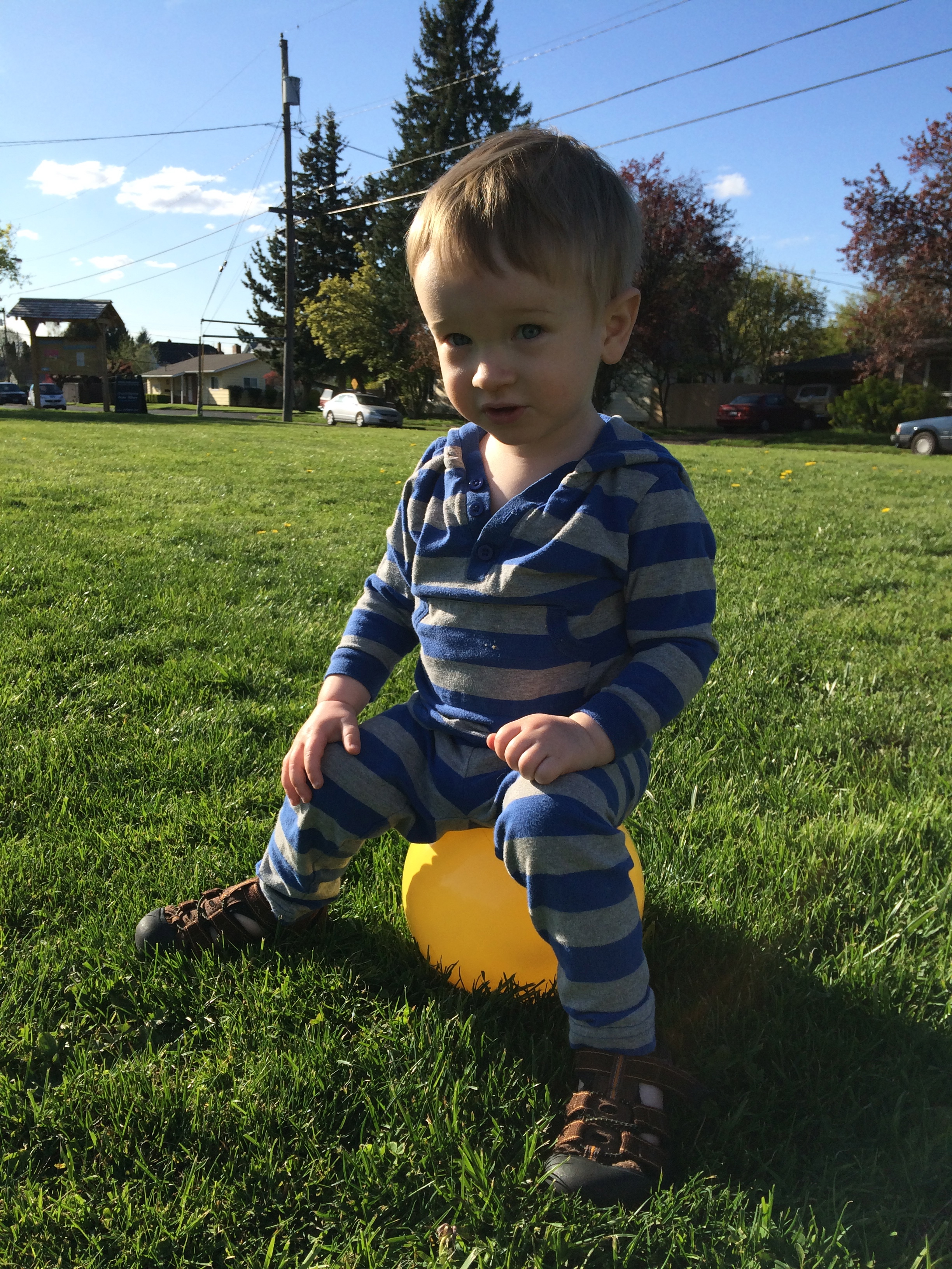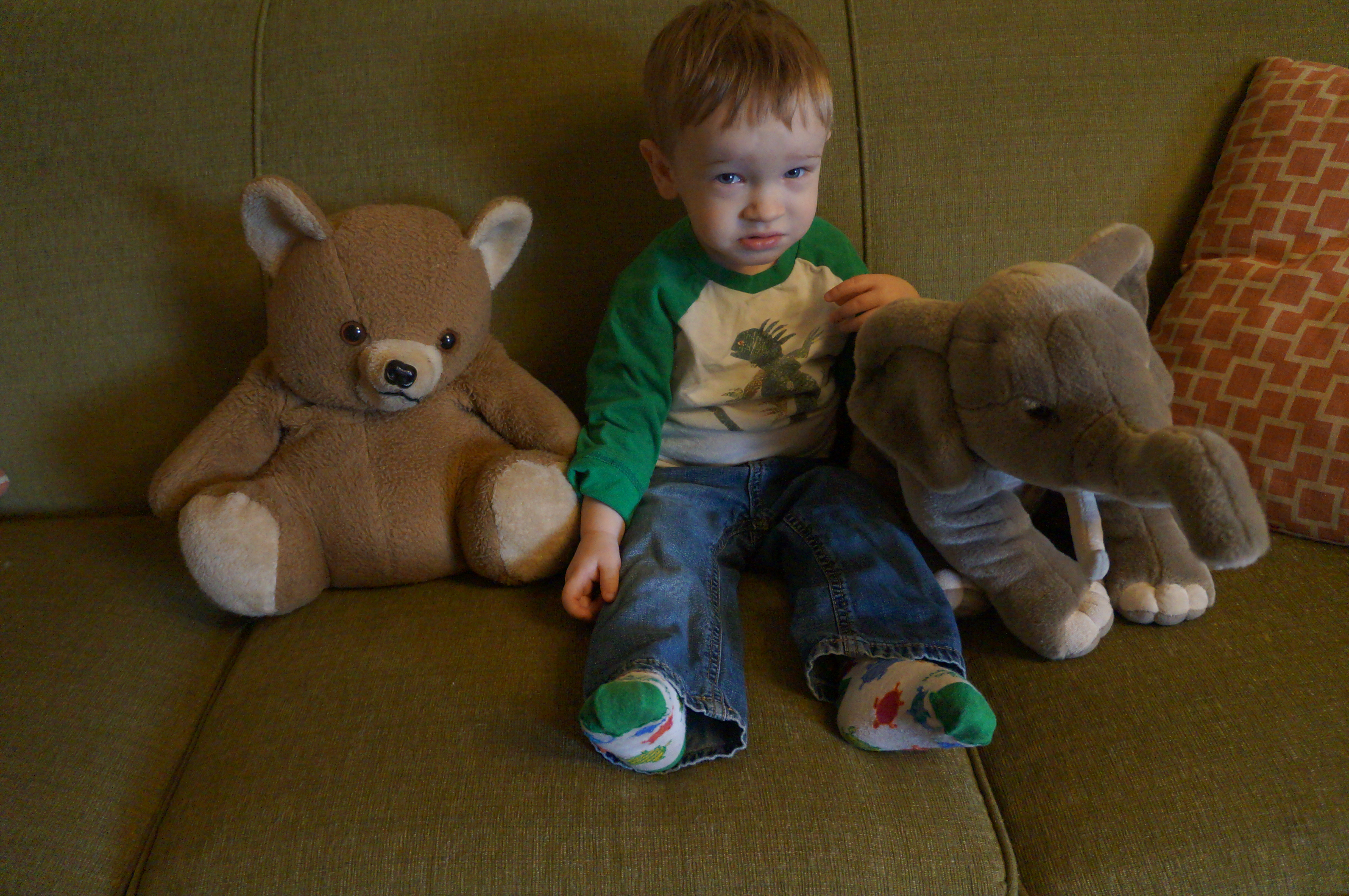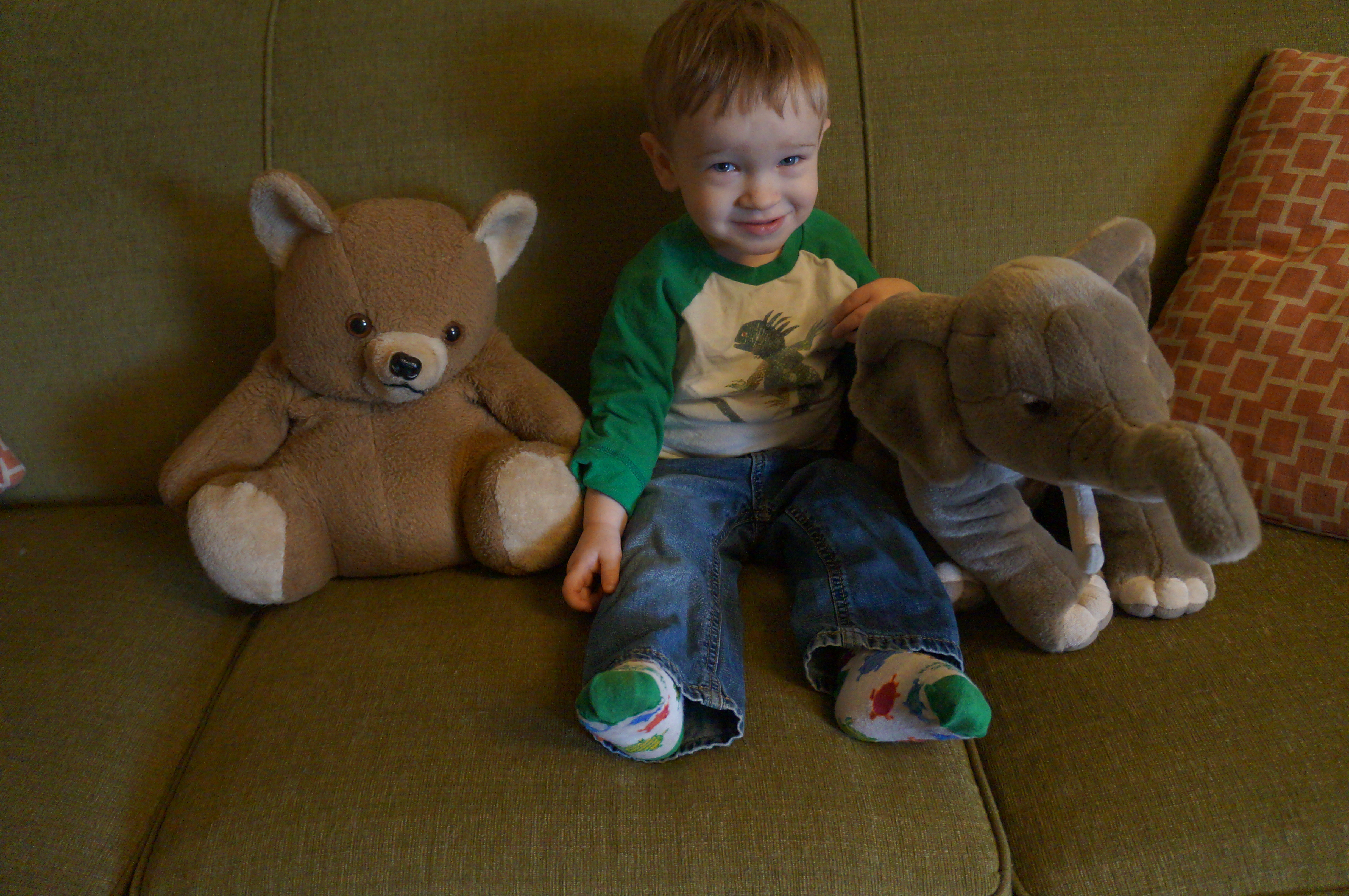 The vocabulary development continues to be amazing to witness. He makes some sentences, such as “Read this book,” “Mommy do it,” and “Mommy read night-night books” (I’m definitely popular around here right now!). He knows colors (red, yellow, blue, green, pink, purple, orange), can count to ten, kind of sings the alphabet (super cute), and recognizes all the numerals and some letters in his books and on signs. He’s starting to memorize some of his books so he can “read” them along with us. He understands so much, too! Today he asked me for “cheese,” and I said, “I’m sorry, we don’t have any cheese. Do you want something else to eat?” and he said, “ba-nana!” Then, while eating the banana, he said, “applesauce!” so I gave him some applesauce. The other food he likes right now is burritos, so he’ll often say, “rito!” or “b’rito!”. I’ve also noticed that he’s starting to say “wa-ter” sometimes instead of “wawa.”