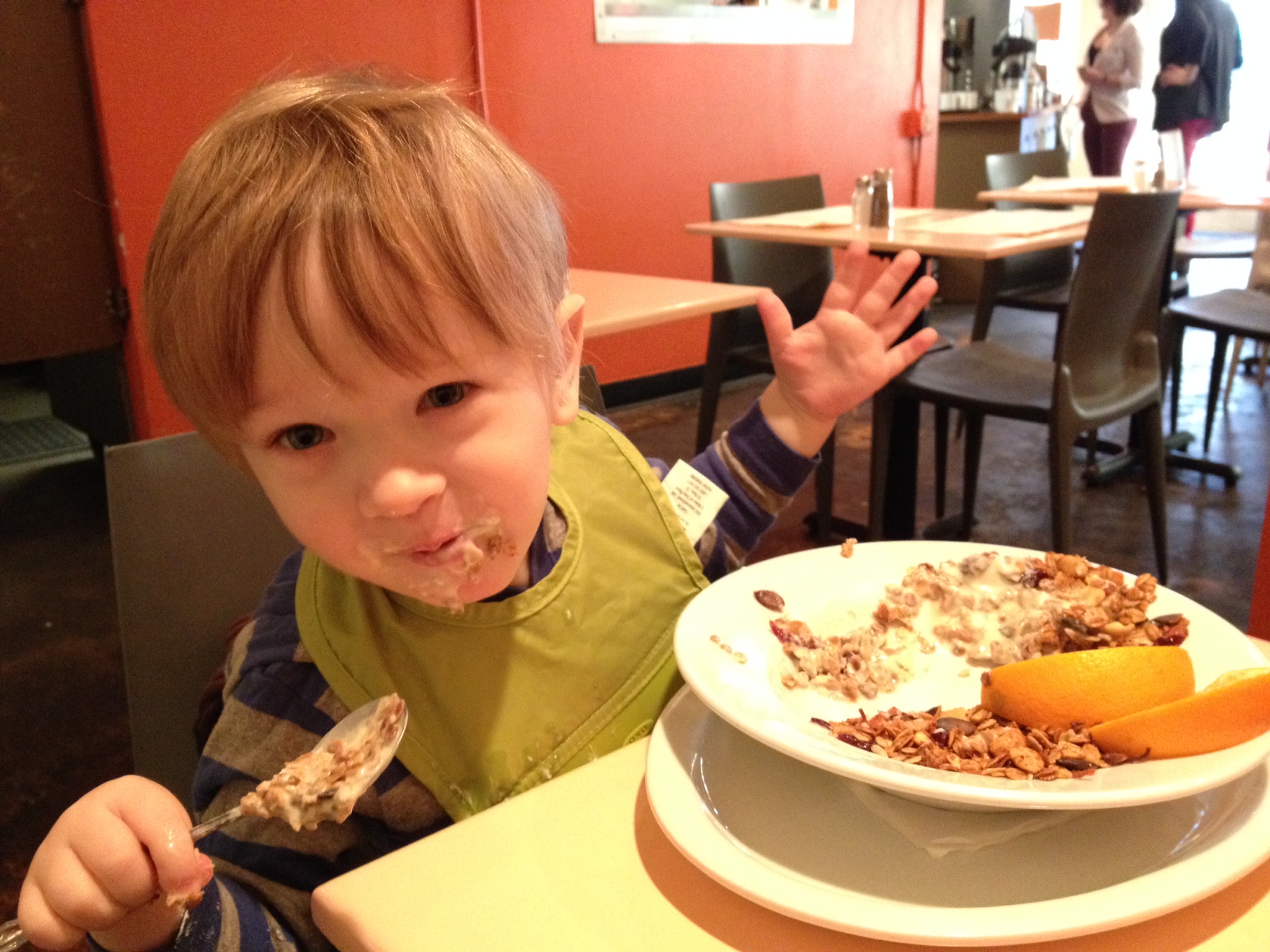 Out to breakfast at one of our favorite neighborhood spots, eating his “cereal”: