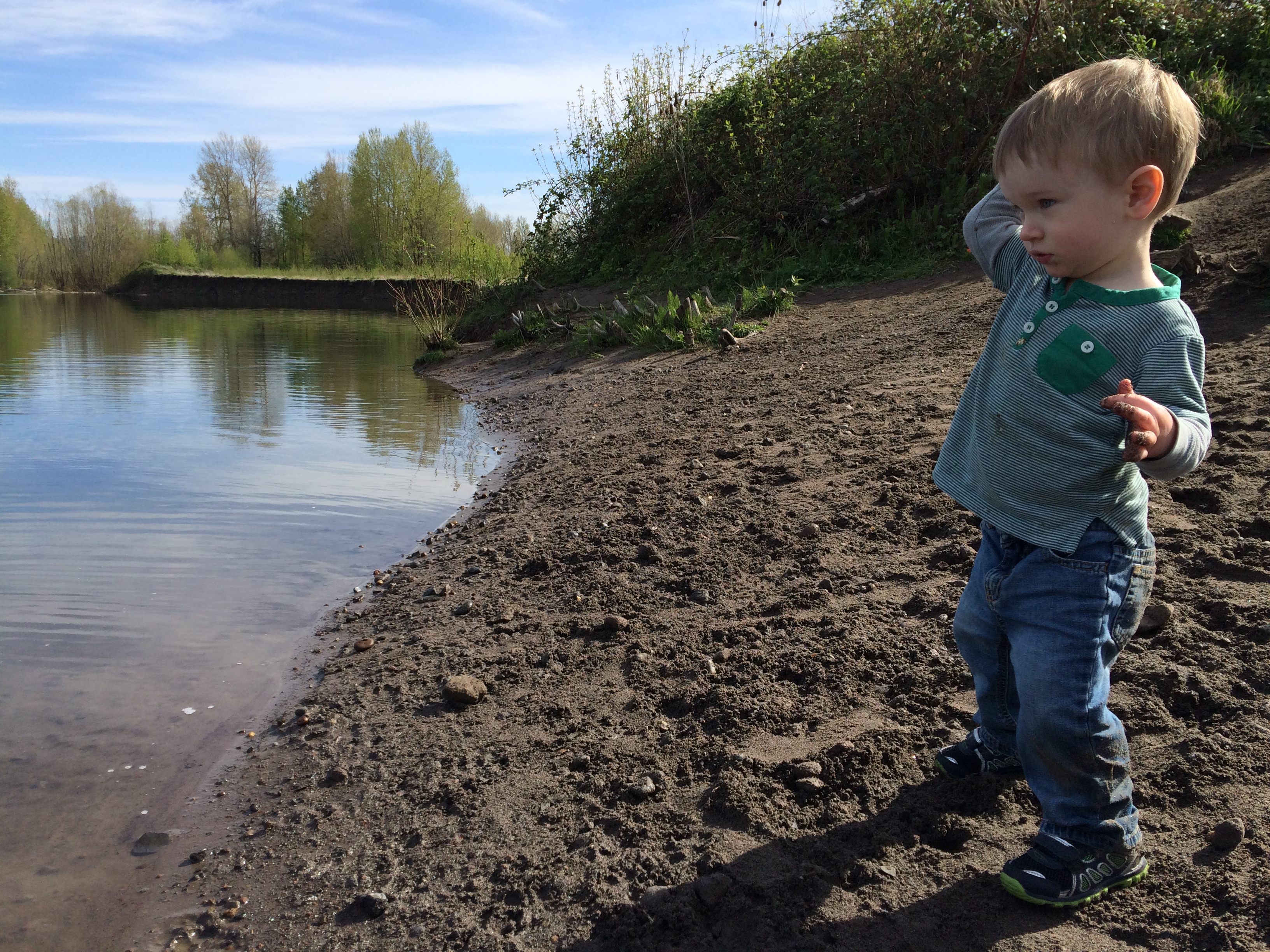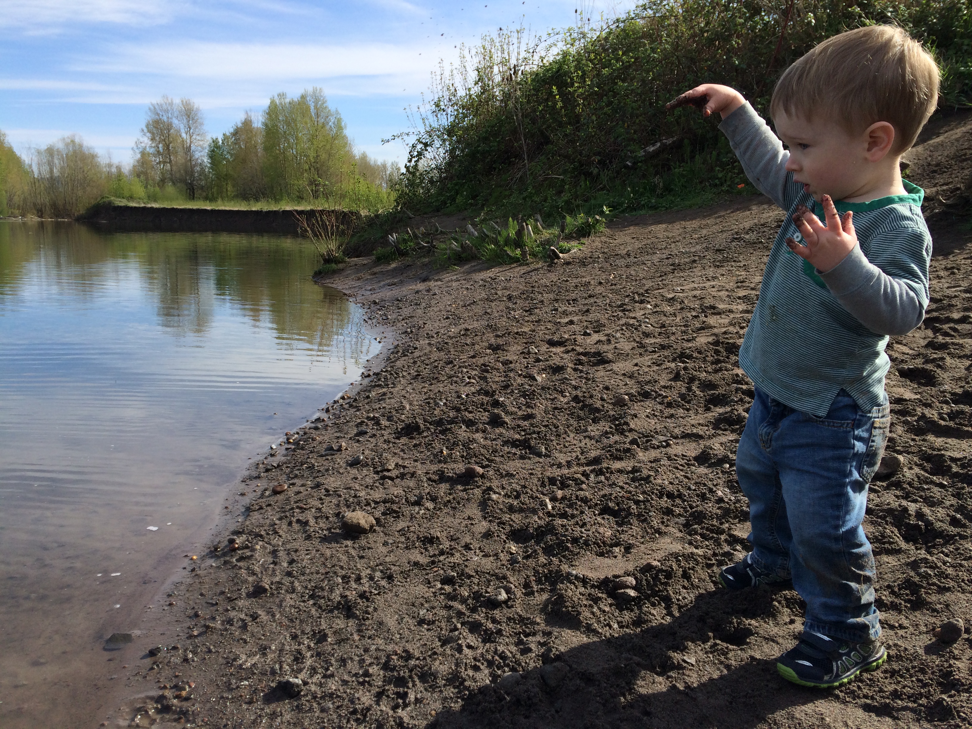 Throwing rocks in the river at Thousand Acres β he also did some wading in the river and didn’t seem to mind his soaked shoes, socks, and pants at all!
