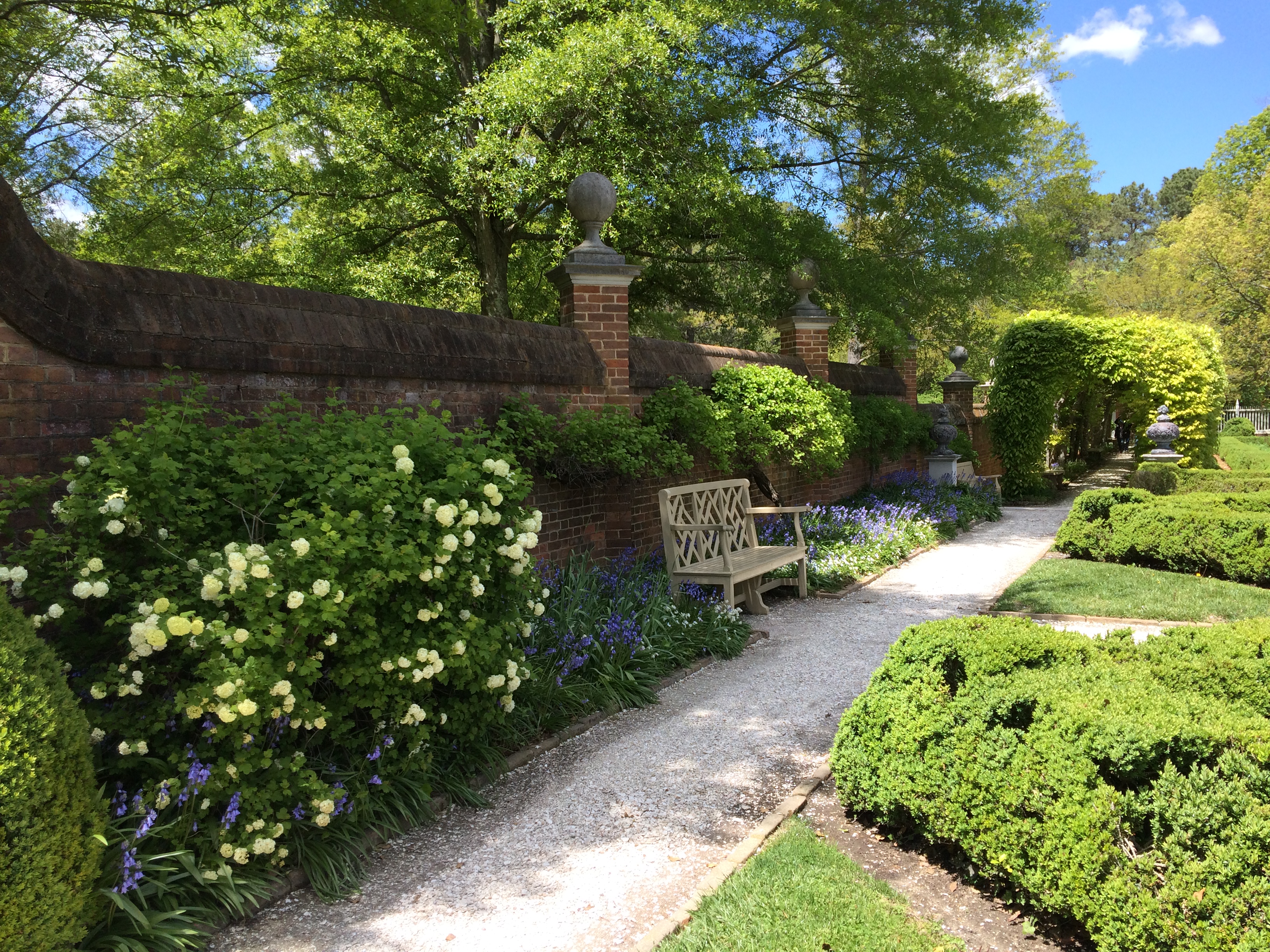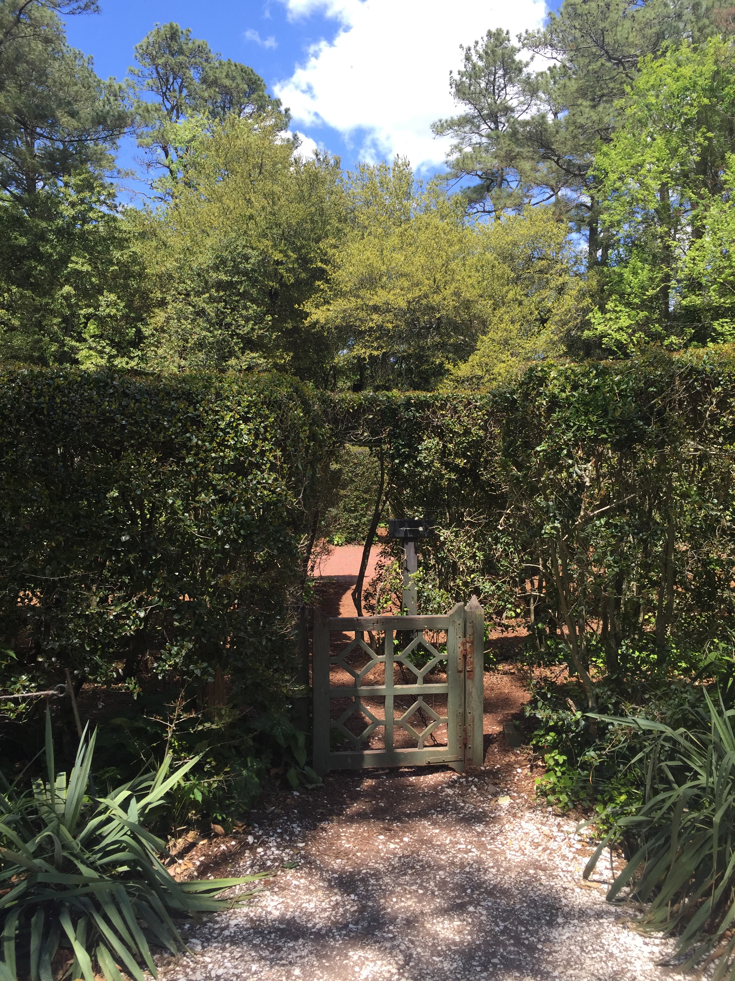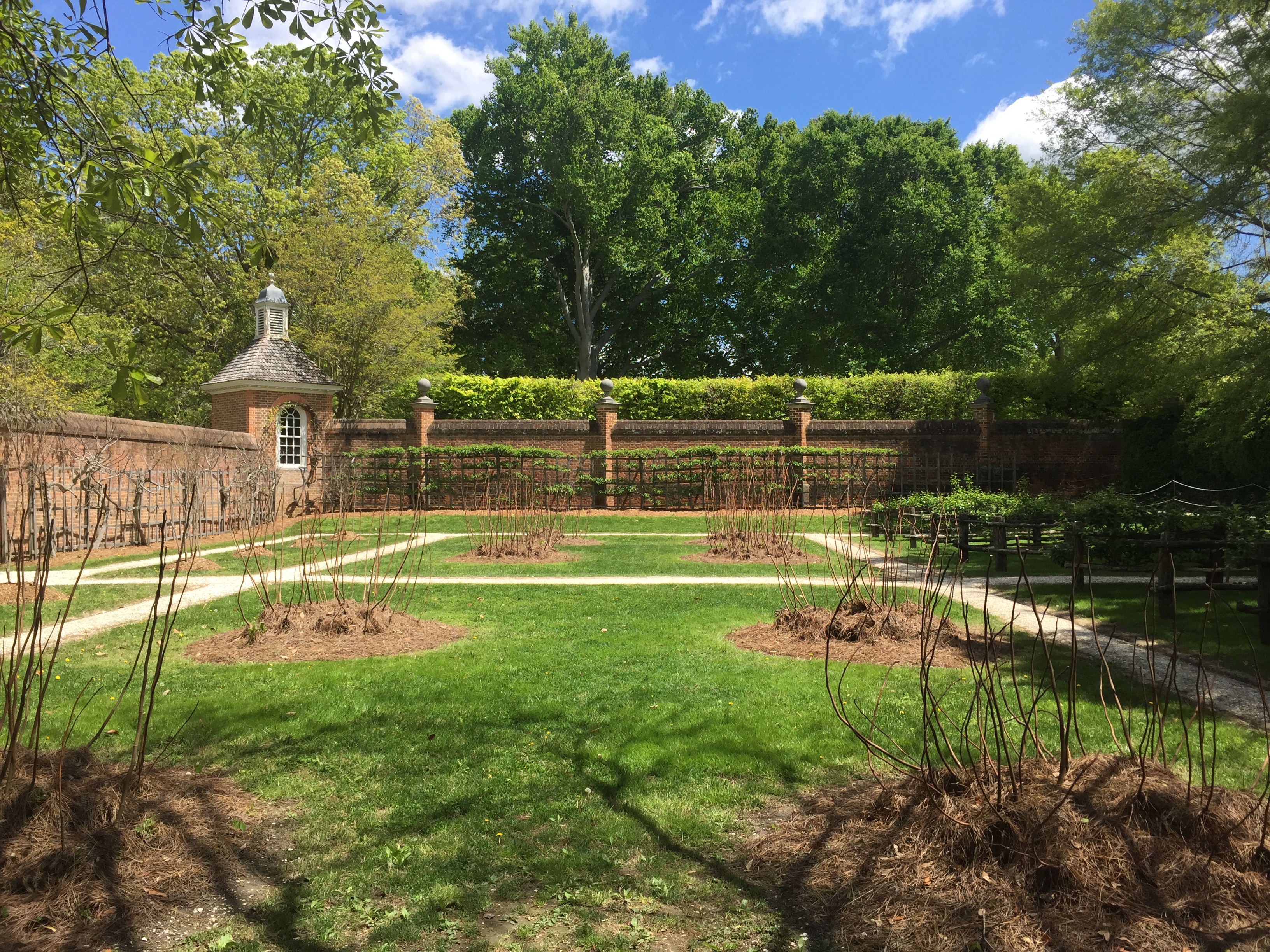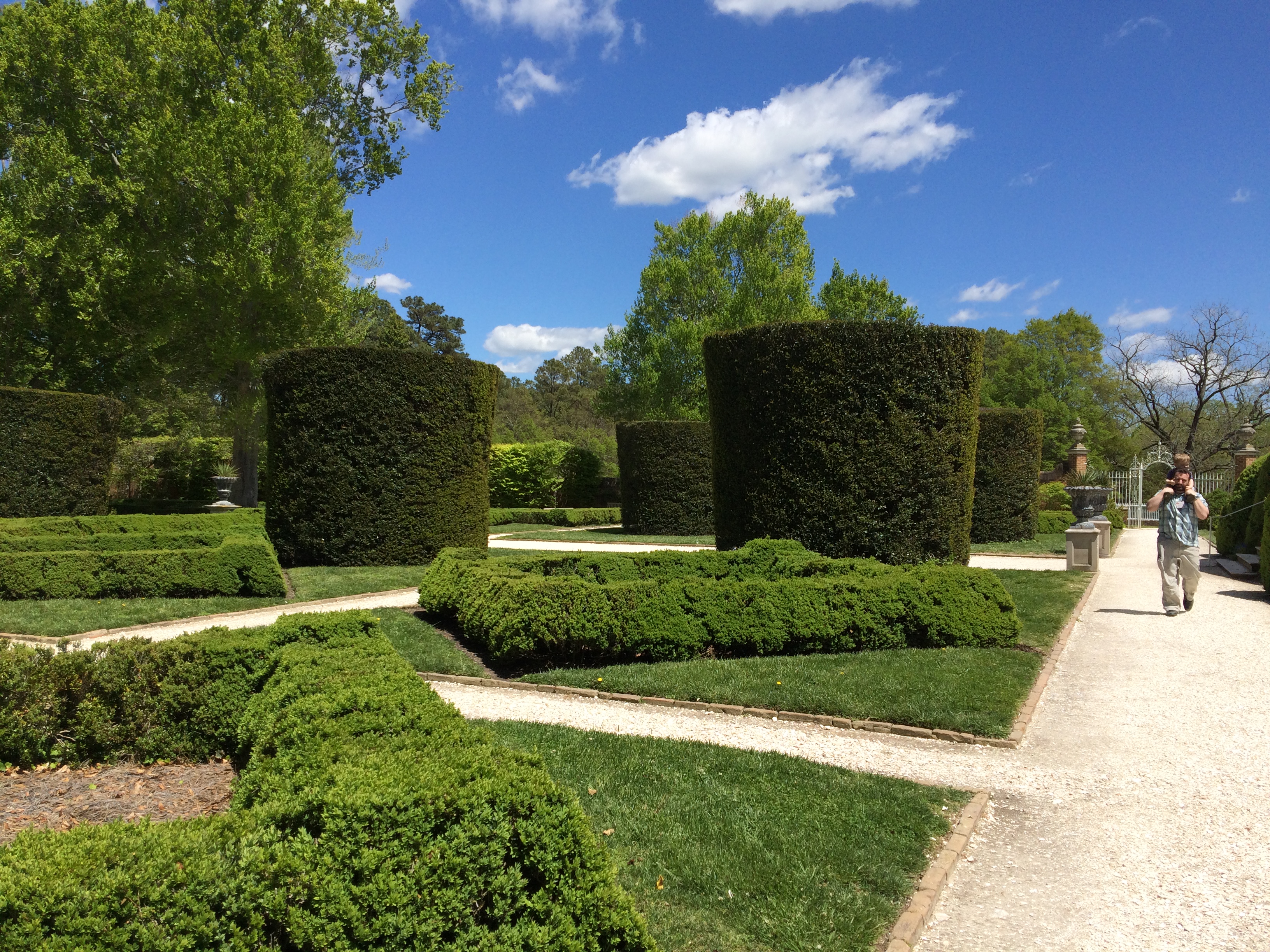 After viewing a demonstration of carding wool, spinning yarn, and weaving cloth, we toured the gardens and buildings behind the George Wythe House (Ari was too noisy for the tour in the house). This arbor was at the end of the very calming geometric stretch of gardens – a lovely spot to sit!