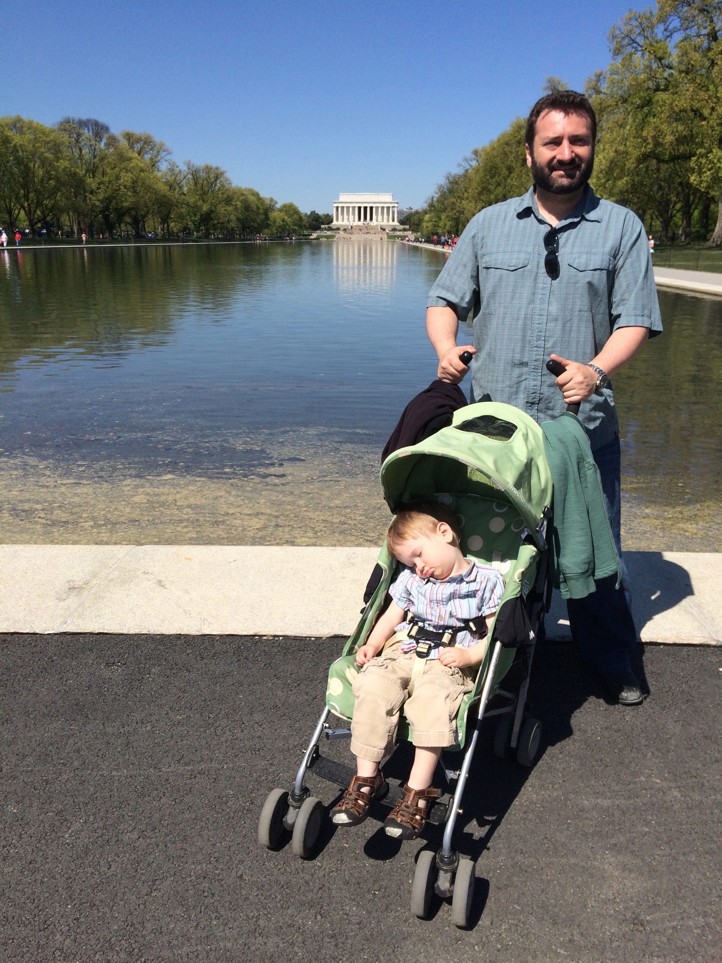 We left Saturday morning and Ari slept for two or three hours of the 6-hour flight. We arrived in the evening in D.C. and drove our rental car to A.’s aunt and uncle’s house, where they had cocktails and dinner ready for us. Ari stayed up and ate with us and then I think we all went to bed together around 10 or 11pm, or 7 or 8pm our time, which is Ari’s normal bed time here.
