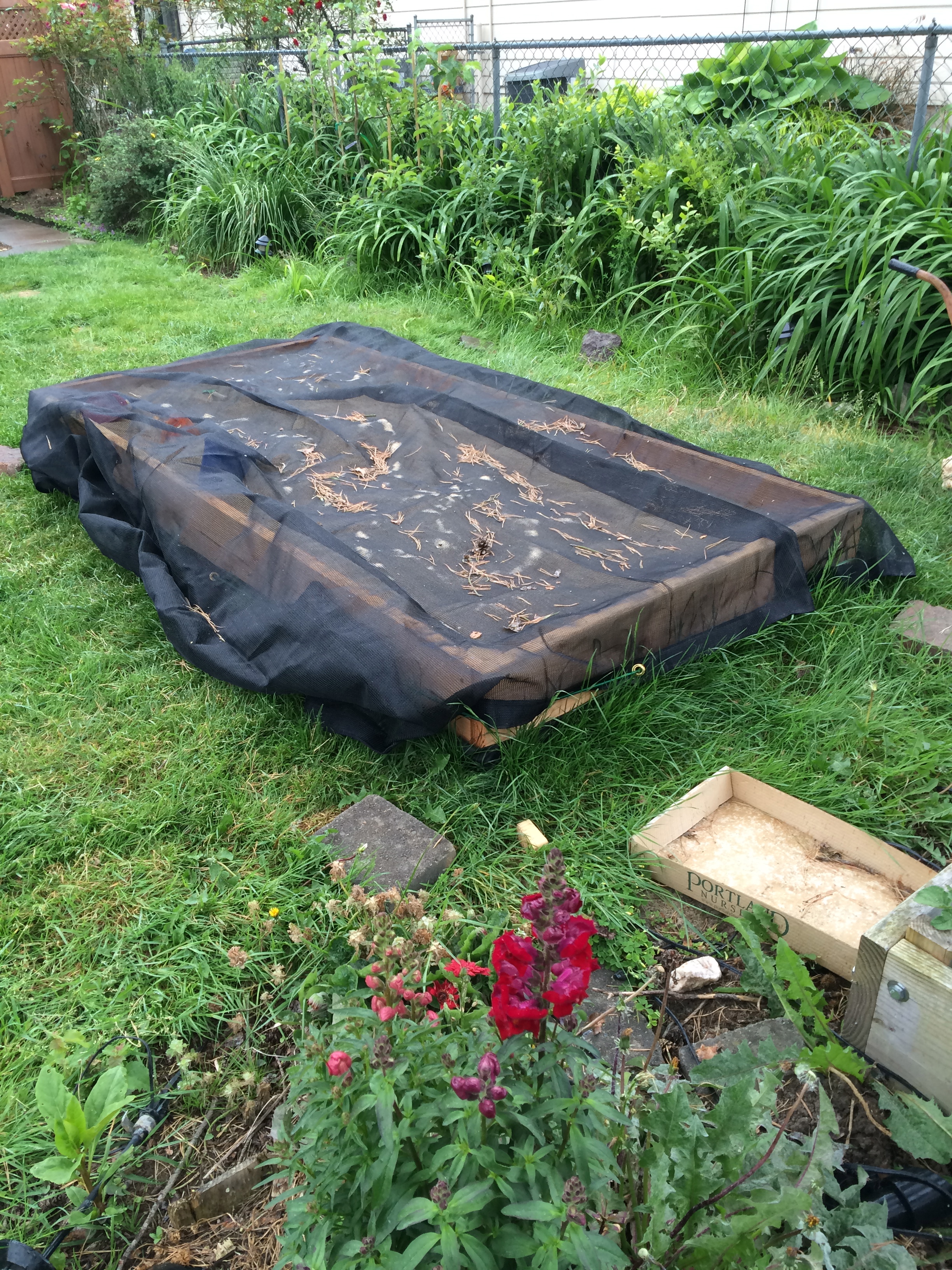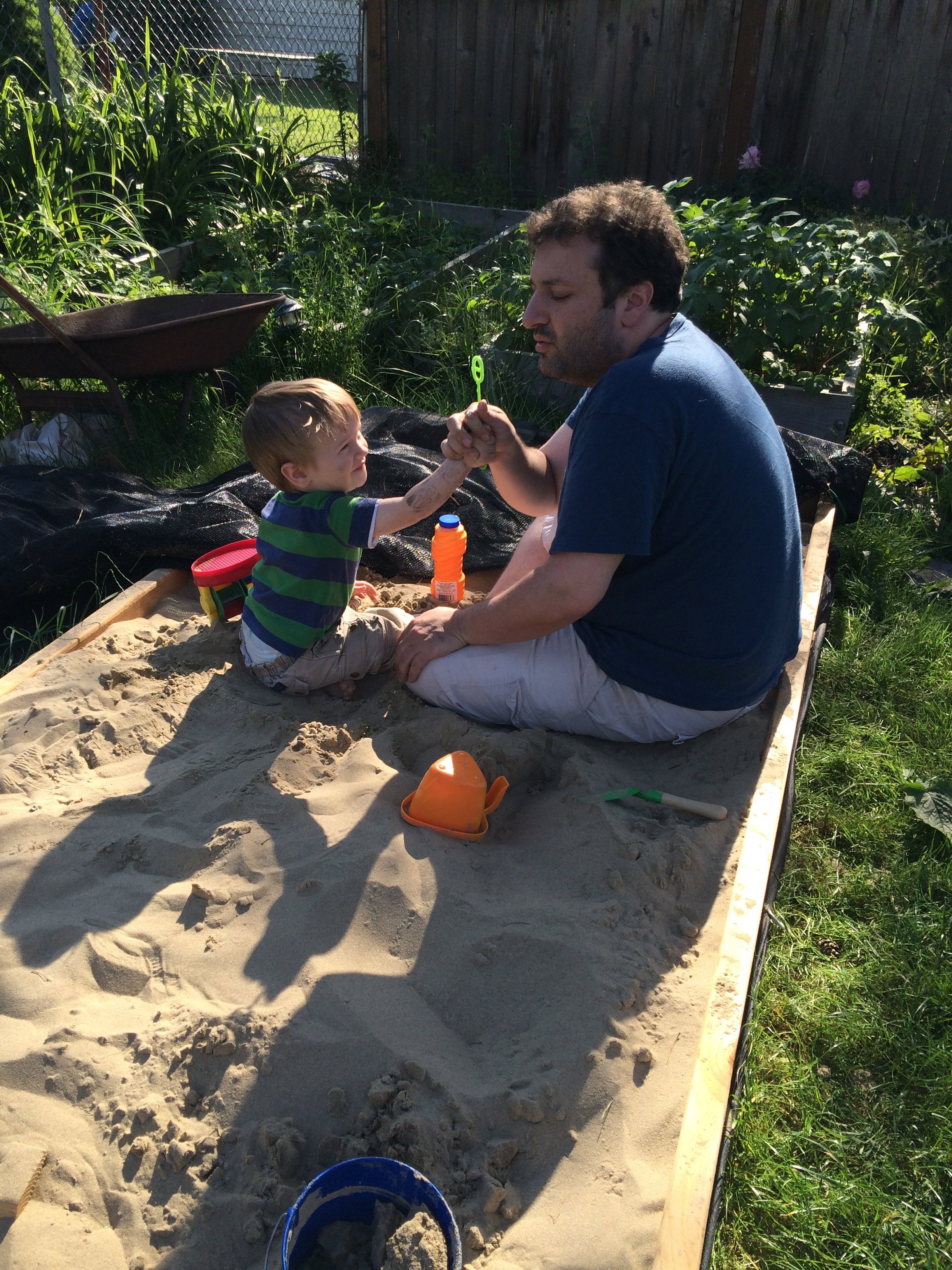 Also on Mother’s Day (May 11th), I took these photos in our yard. The first one is the sandbox with the mesh cover that A. made. The cover keeps out animal droppings but lets the rain in so the sand can get wet and dry out like it would at the beach.