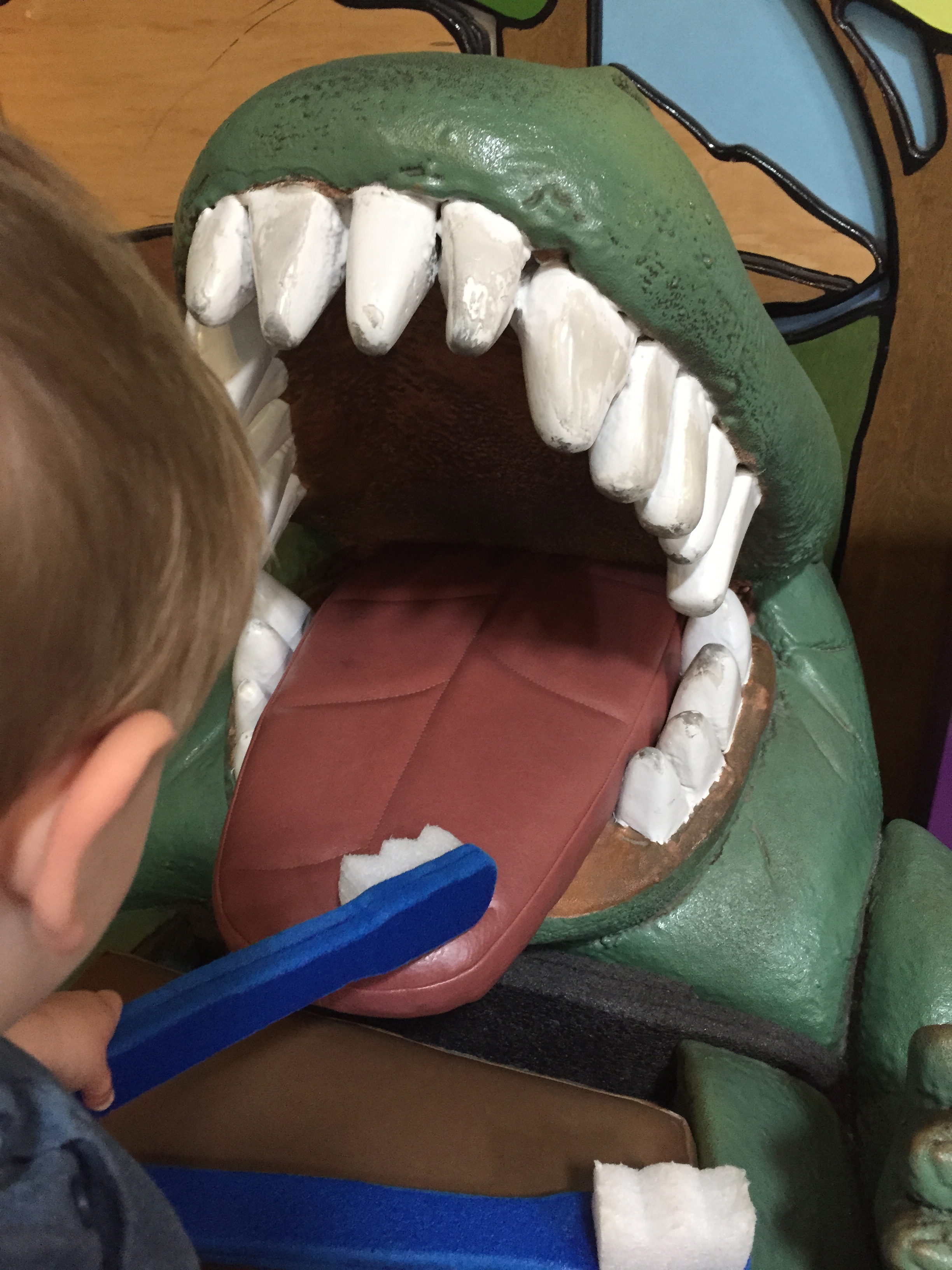 On May 17th, the day Ari turned 23 months old, he was finally brave enough to “brush the alligator’s teeth” at the Children’s Museum! I was at work that day. When I had taken him earlier in the month, the reason we went was that he had been saying, “brush alligator’s teeeth!!” over and over for days and especially all that morning, and he’d been practicing with his tiny stuffed alligator doll (with no teeth) at home. But every time we go there, he shrieks and clings to us when we so much as enter the room with this alligator dentist office set-up. When I took him, I grabbed a tooth brush and took it in another room and he still wouldn’t touch it. This has been going on for months! But while I was at work, A. took him and after multiple aborted attempts, was finally able to sit and hold Ari next to the alligator, and Ari actually held the toothbrush out while still clinging to A. I was so excited when I got the photo at work. 🙂