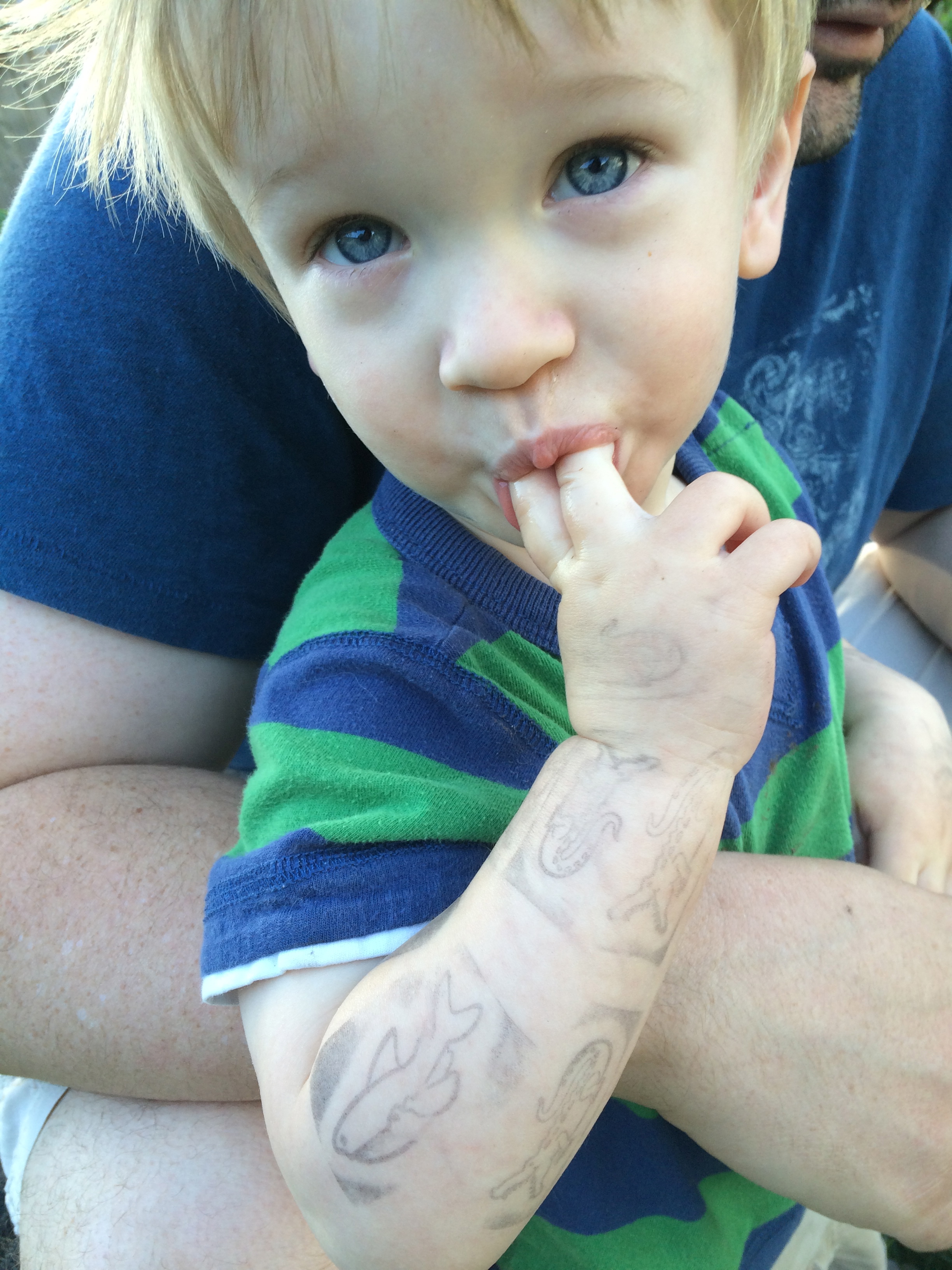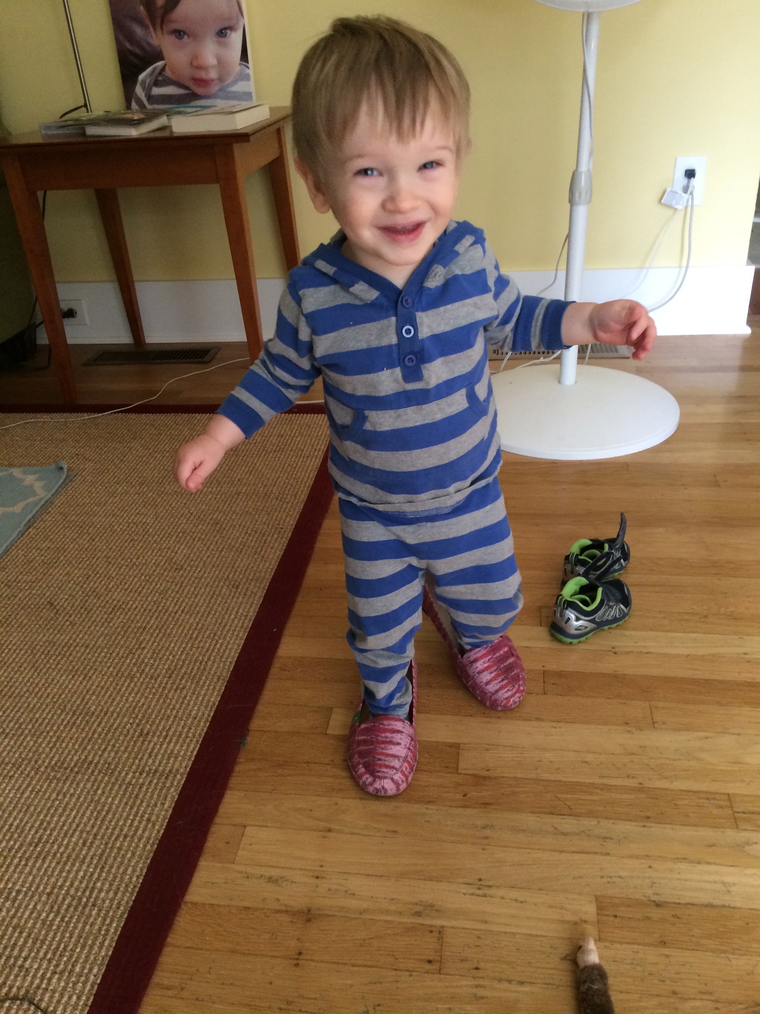 We’re working on getting him to sleep in his own room. He’ll go to sleep in his room, on his floor bed, and we’ve just started sitting next to him and leaving the room for brief periods instead of lying down and cuddling while he goes to sleep. I started out by telling him he needed to start falling asleep by himself, and he started wailing before I was even finished talking, so I was pretty sure he understood. The second time I walked out of the room that night, he went to the door and started screaming for “Daddy” instead of me, which was a first! Kind of sad for me, but then A. went in and he walked right back to bed, lay down, and went to sleep on his own while A. sat there, rather than wriggling around in his arms screaming for “Mommy,” and that was really nice for A. He usually wakes up once before we go to bed, and we get him back down in his bed, then he wakes up again around midnight or 1 and comes to our bed, although lately sometimes he’s in his own bed until 3 or 4 am, and one night he was there until 6am! Of course, I still woke up around 3 and had to go check on him.