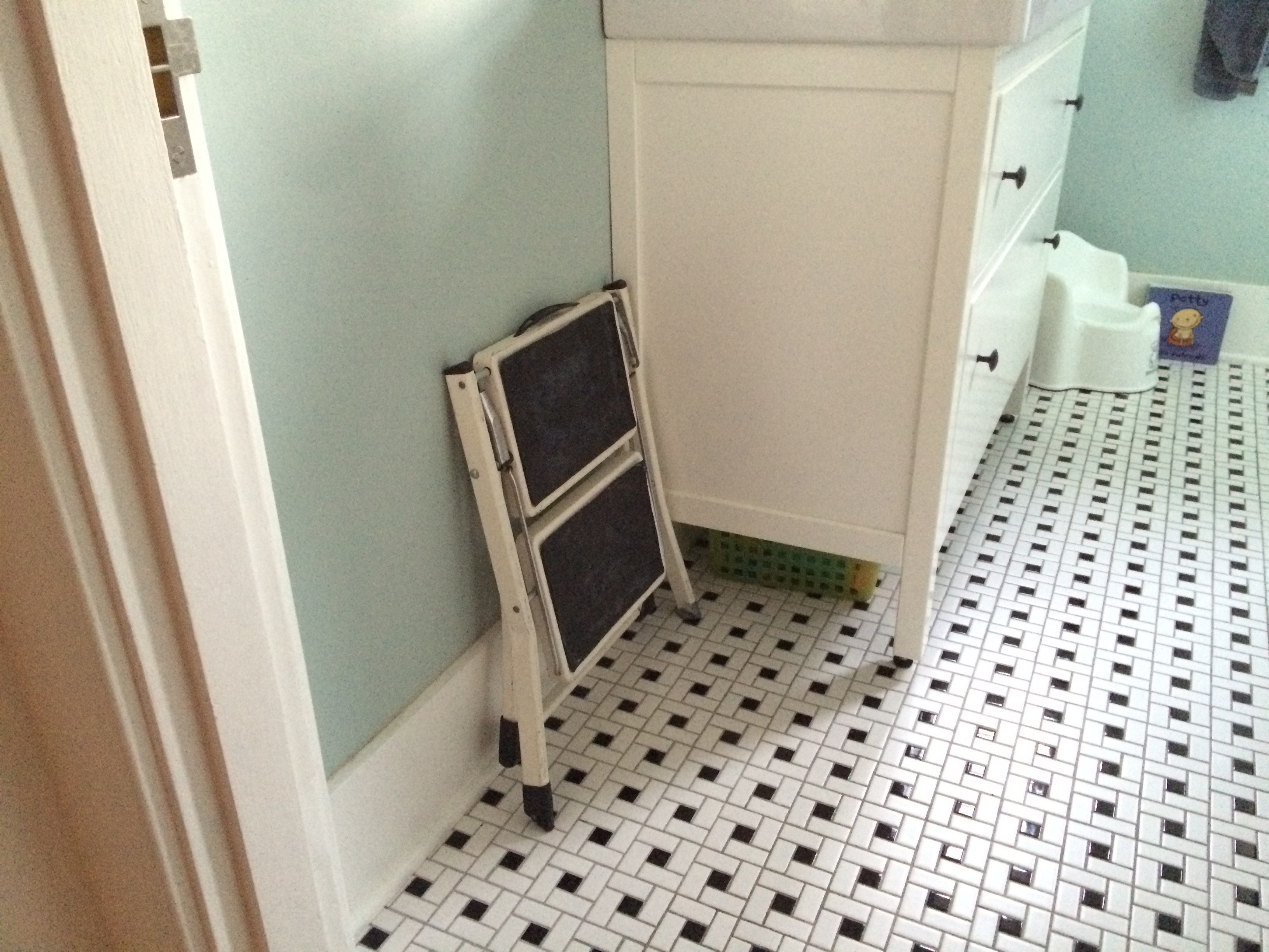I’m proud of this cheap Montessori-style “hack” we’ve got in the bathroom now. (Similar to our plastic stuck-on coat hook at his height by our front door – I love the Montessori ideas and furniture designed to promote toddler independence! They also emphasize using natural materials, usually wood, but that can get expensive and time consuming.) I bought this stool some time ago at a thrift store, cleaned it, and stored it in the shed until I thought Ari was big enough to use it. I pulled it out recently and he loves it! It makes washing his hands so much easier. He climbs up by himself and can just barely reach the faucet and the soap. He holds on to the edge of the sink while he climbs up, and I stand right behind him.
