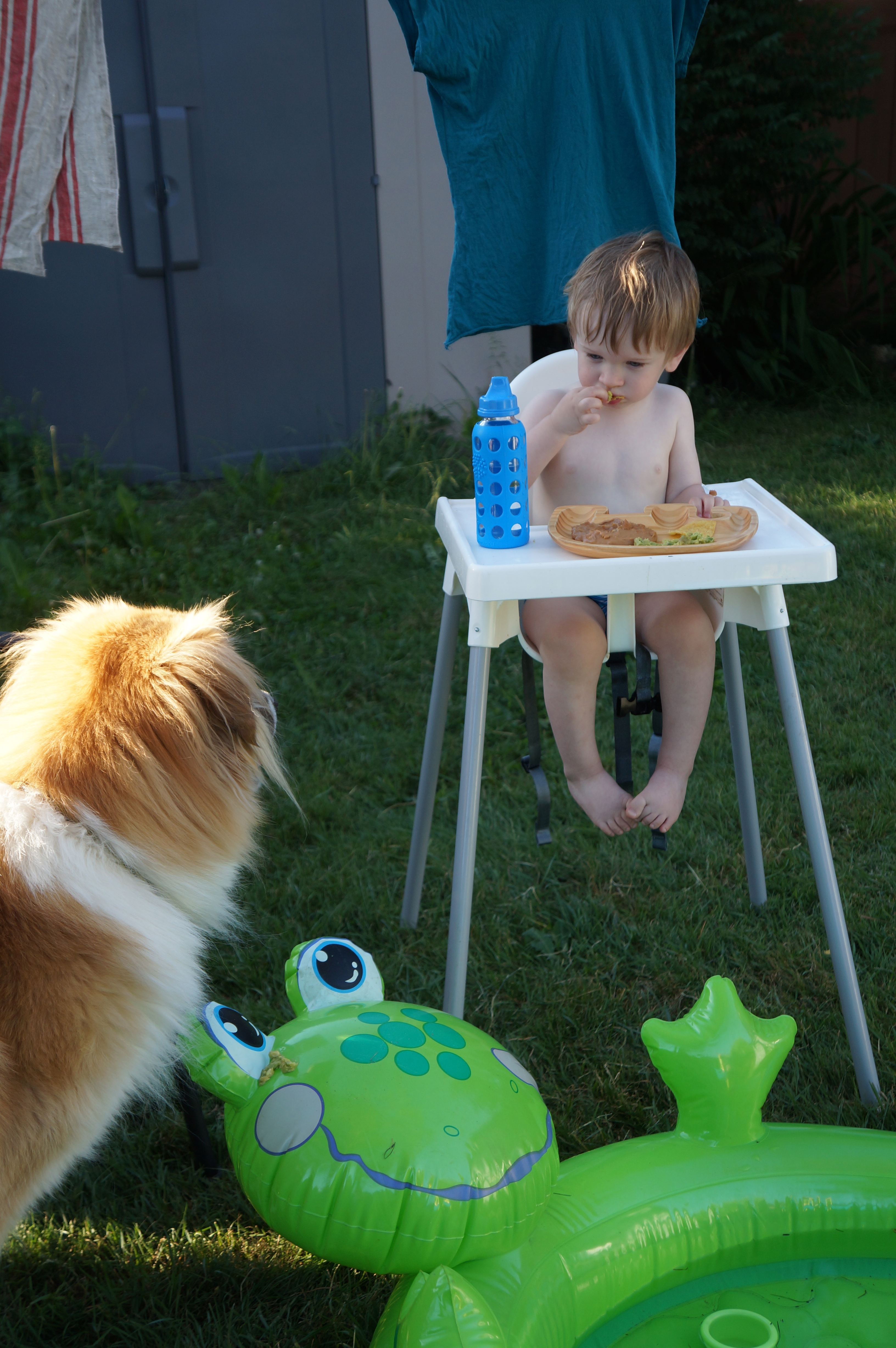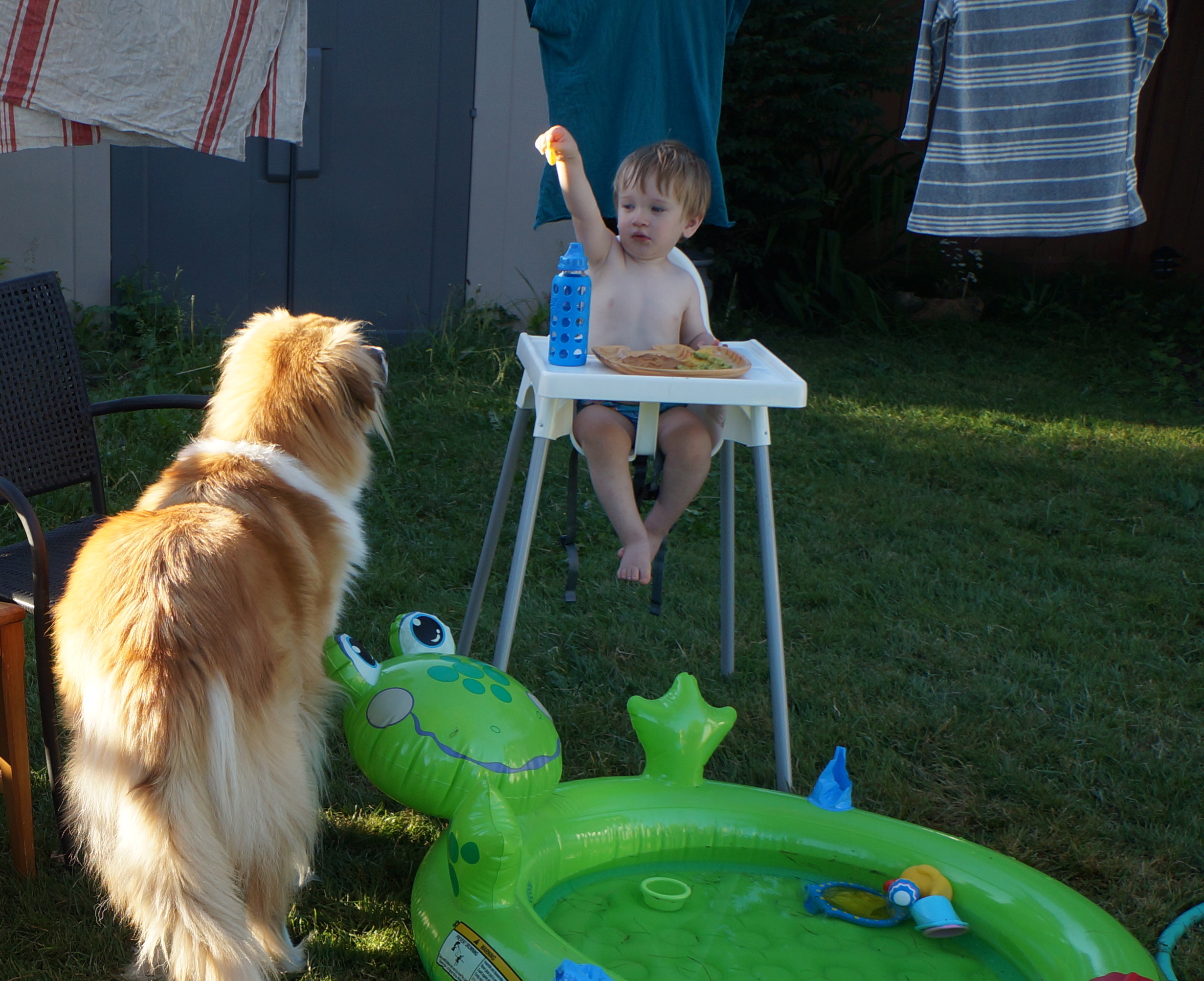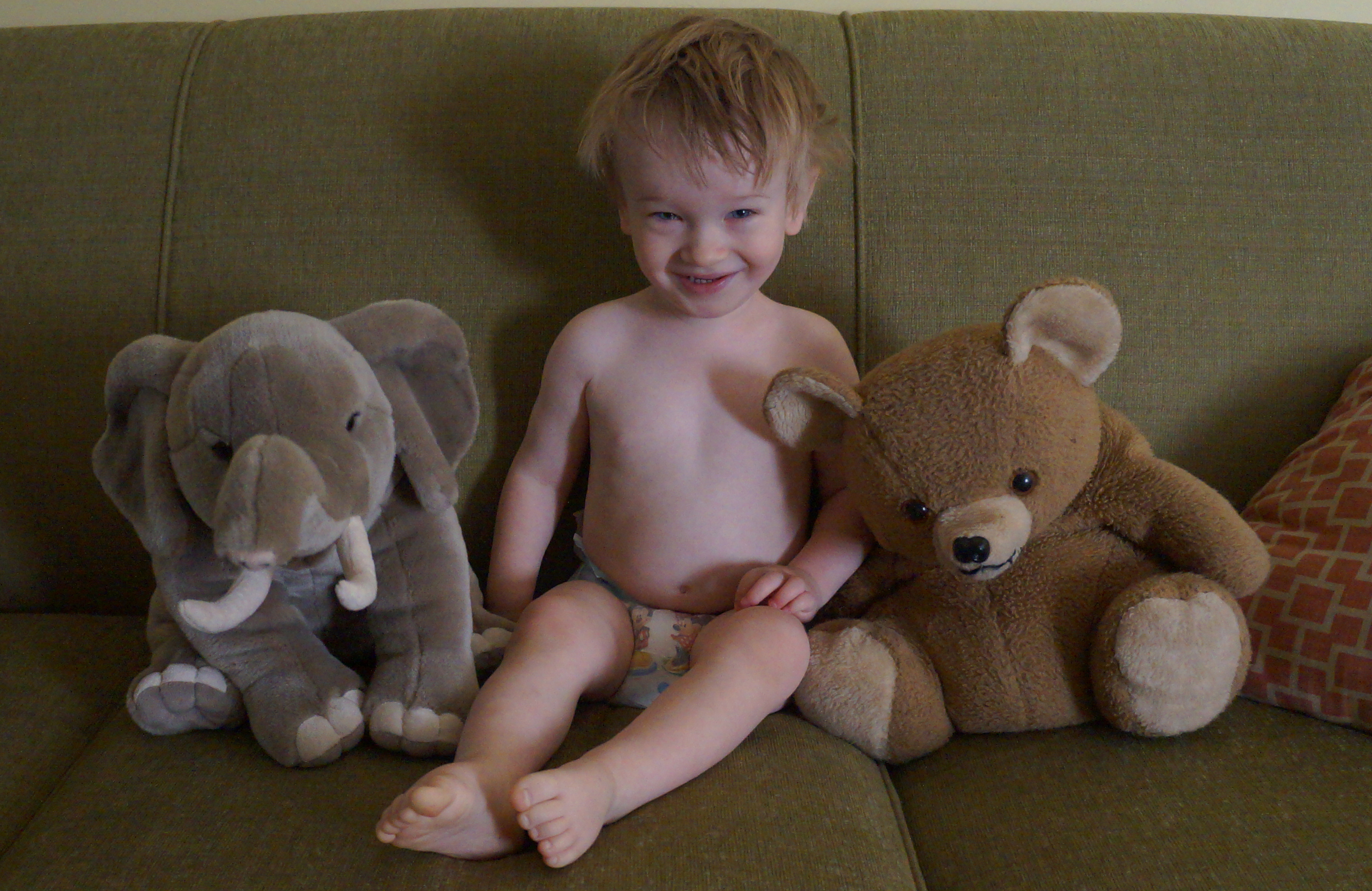 I was off during the weekend and we had some lovely family days, with friends over for backyard barbecuing and kiddie water play, too (we had some 90-degree days!). One day, he pulled his elephant and bear off the shelf, carried them to the couch, and said, “Get the camera!” (Or “take a picture,” I can’t remember…but I think it was “camera”.) I obligingly took some pictures but he really just wanted to hold the camera and take his own.