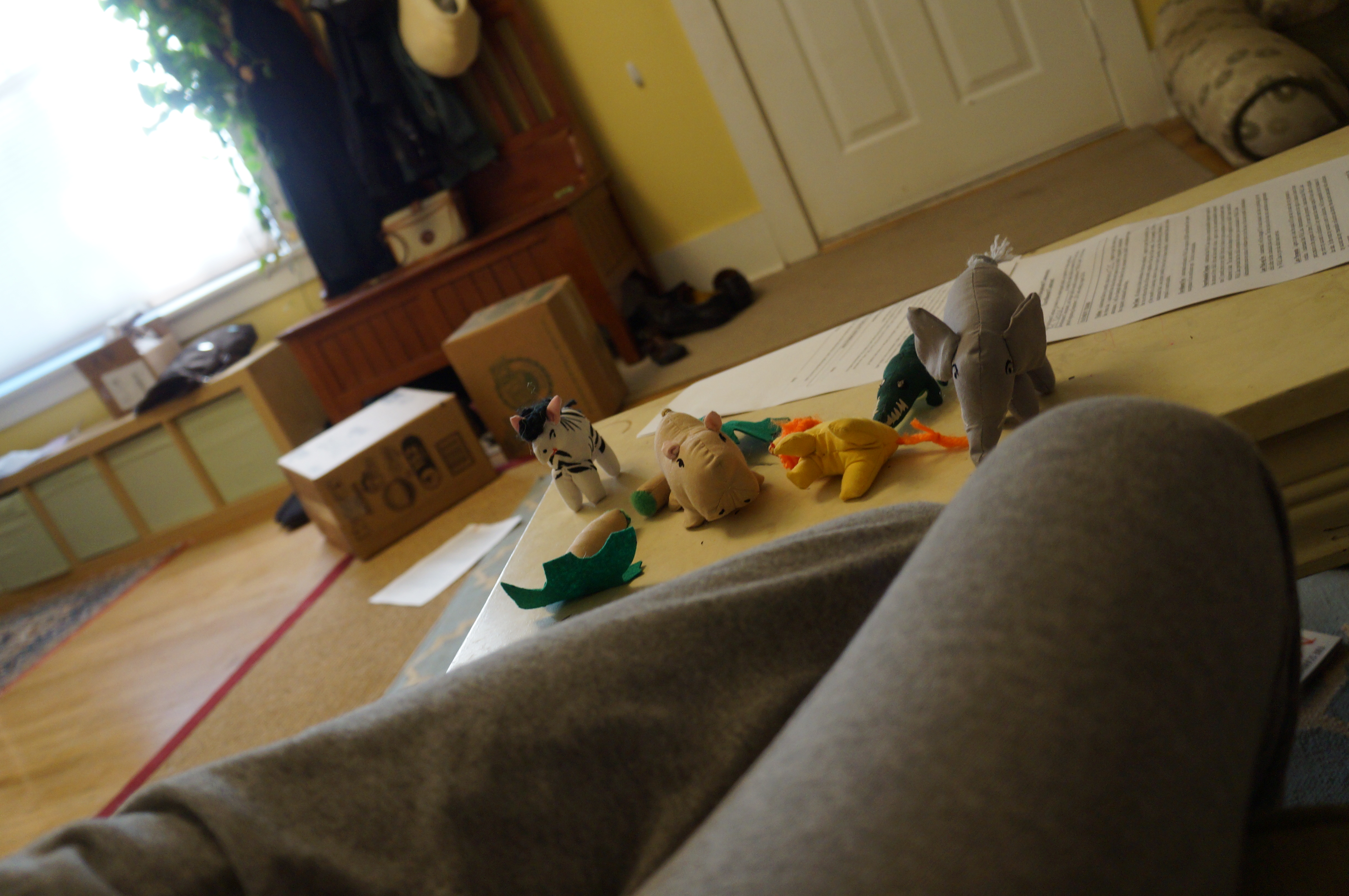 He’s playing with dolls more and more. One day he crammed as many as he could into his arms, walked out of his room, and said, “Look at all the animals!” At night, he put some away in their baskets, and laid some down on his bed, saying good night to each one, and while laying down his Elmer doll, “Time to go to sleep!”