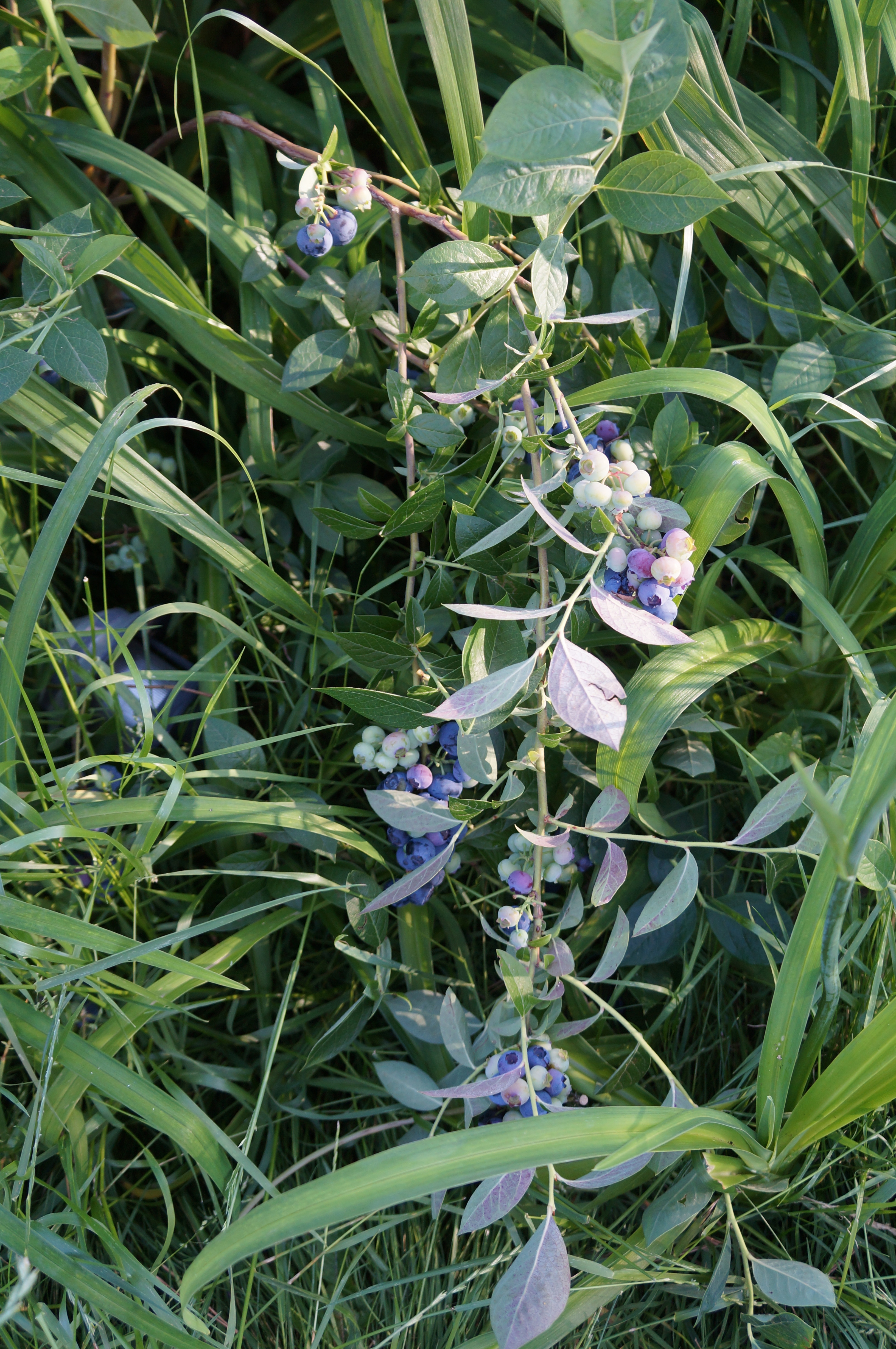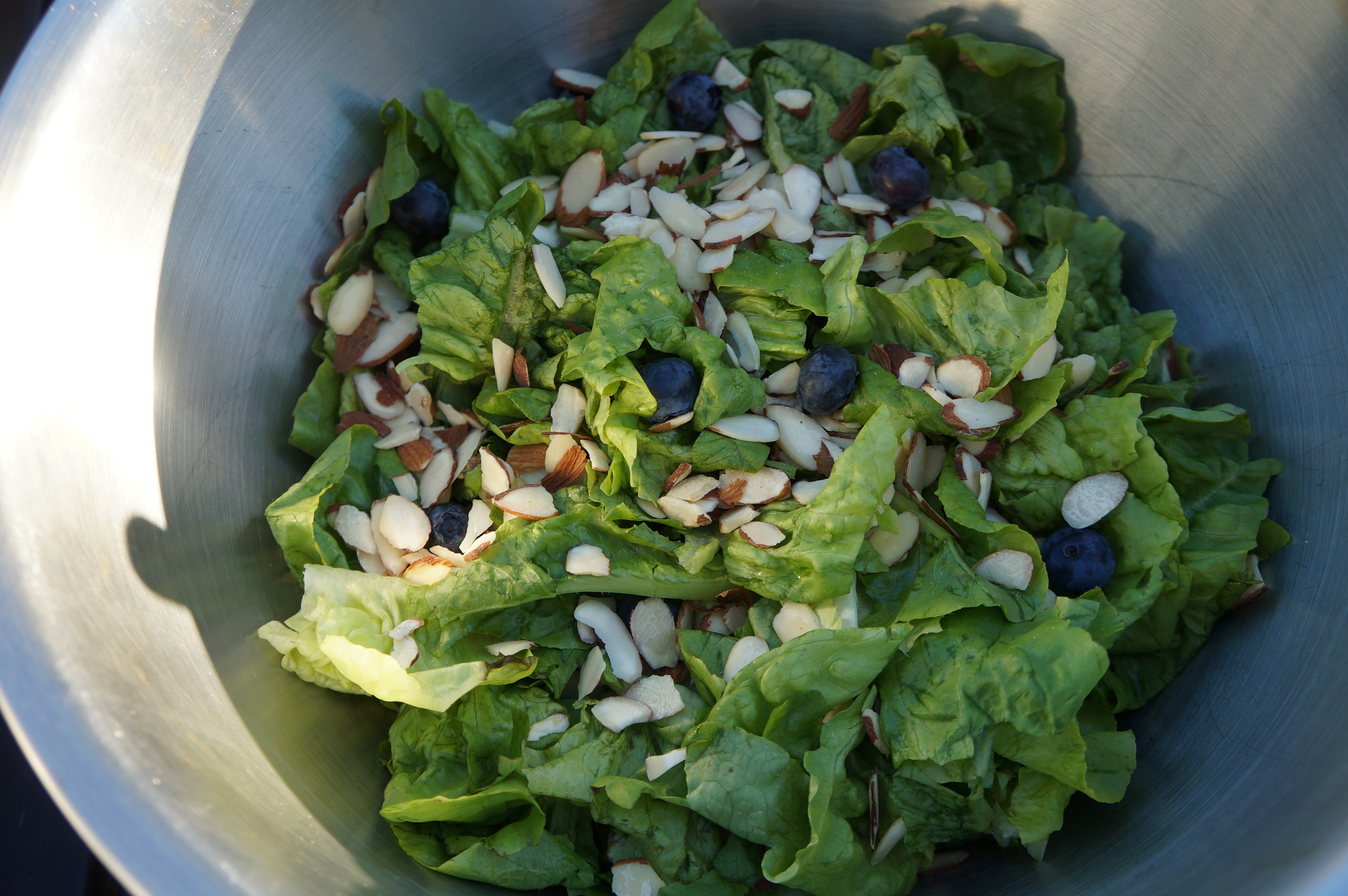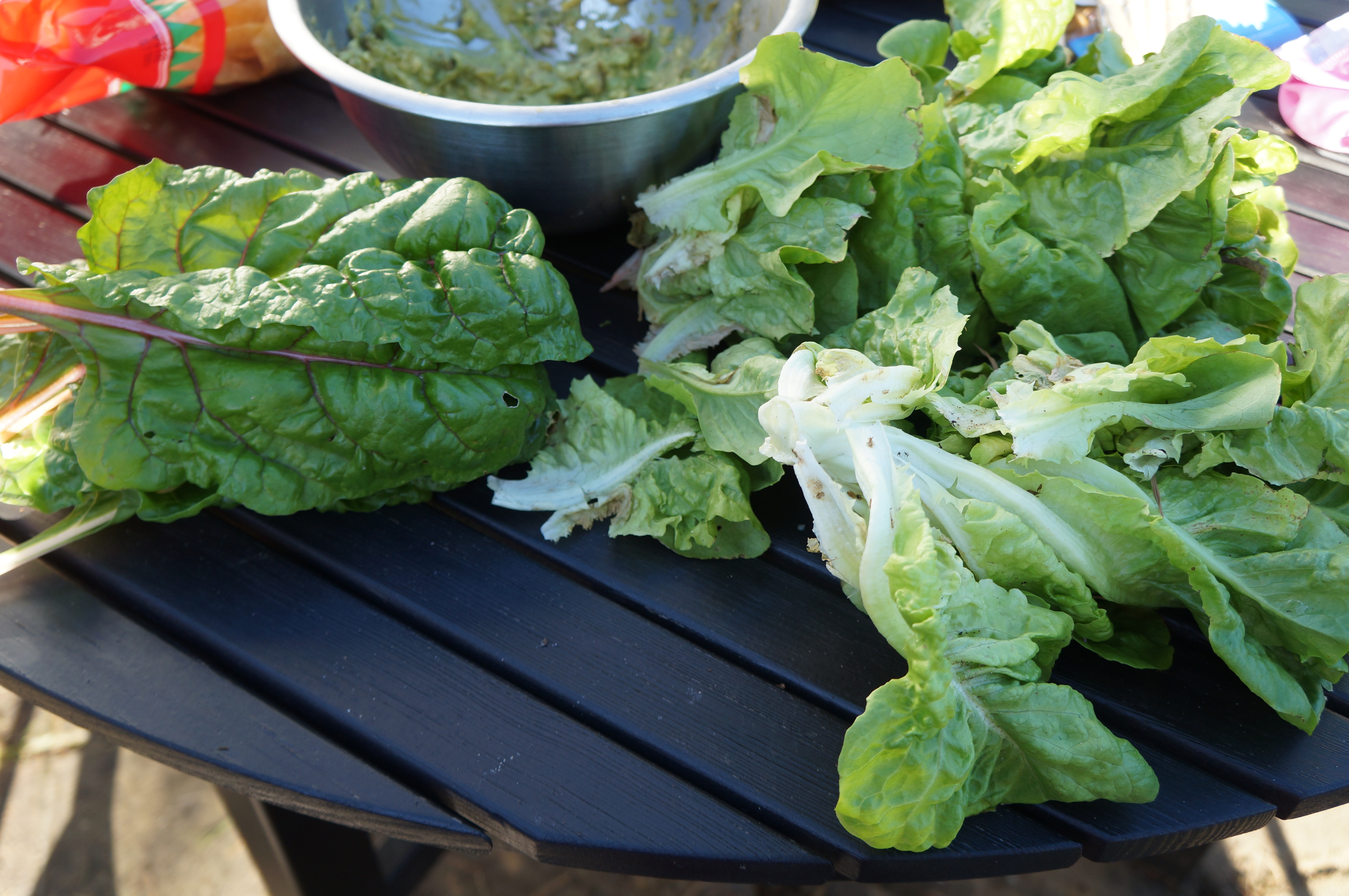 We’ve been harvesting garden produce recently. Lots of swiss chard, which A. sautés for me for pasta, and lettuce and blueberries, plus a few strawberries and raspberries, and a potato.
