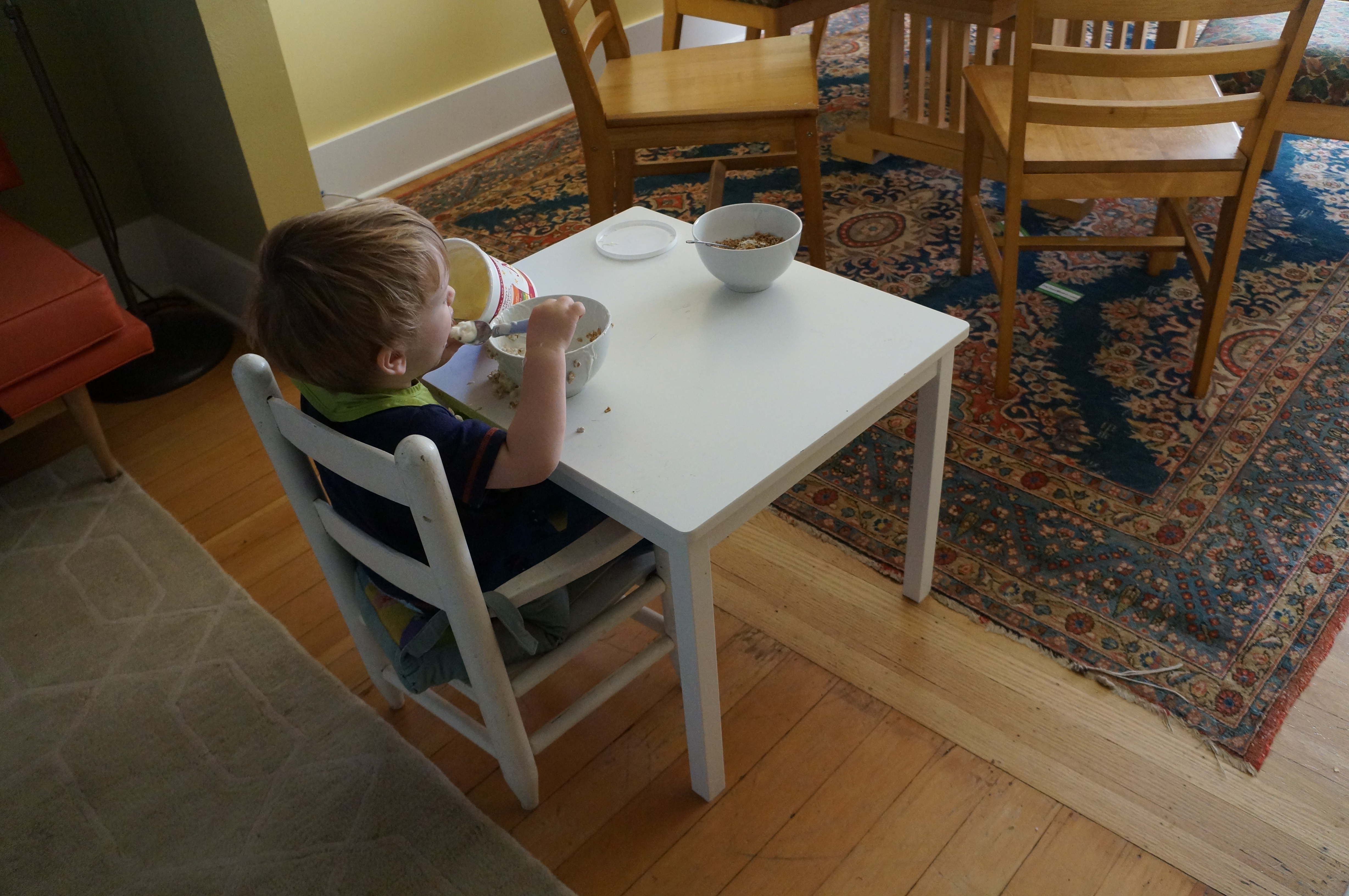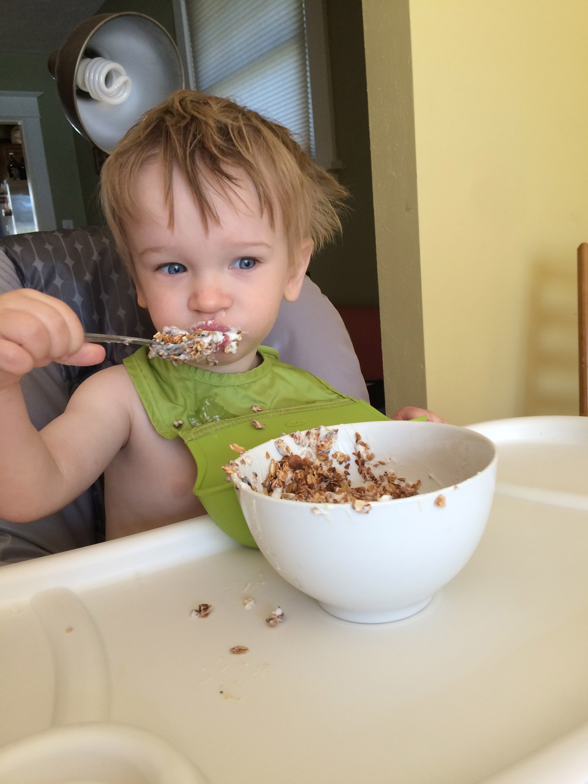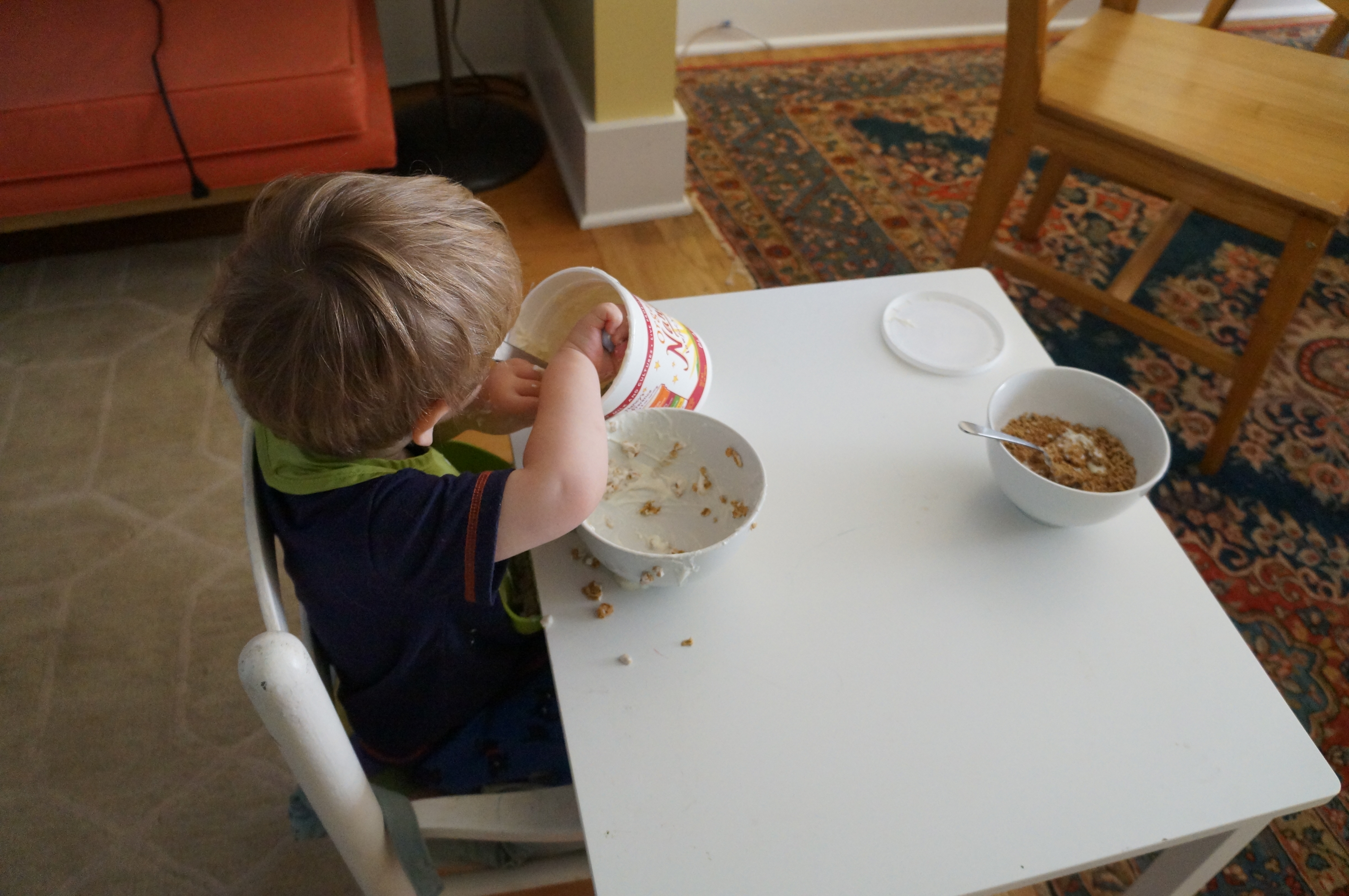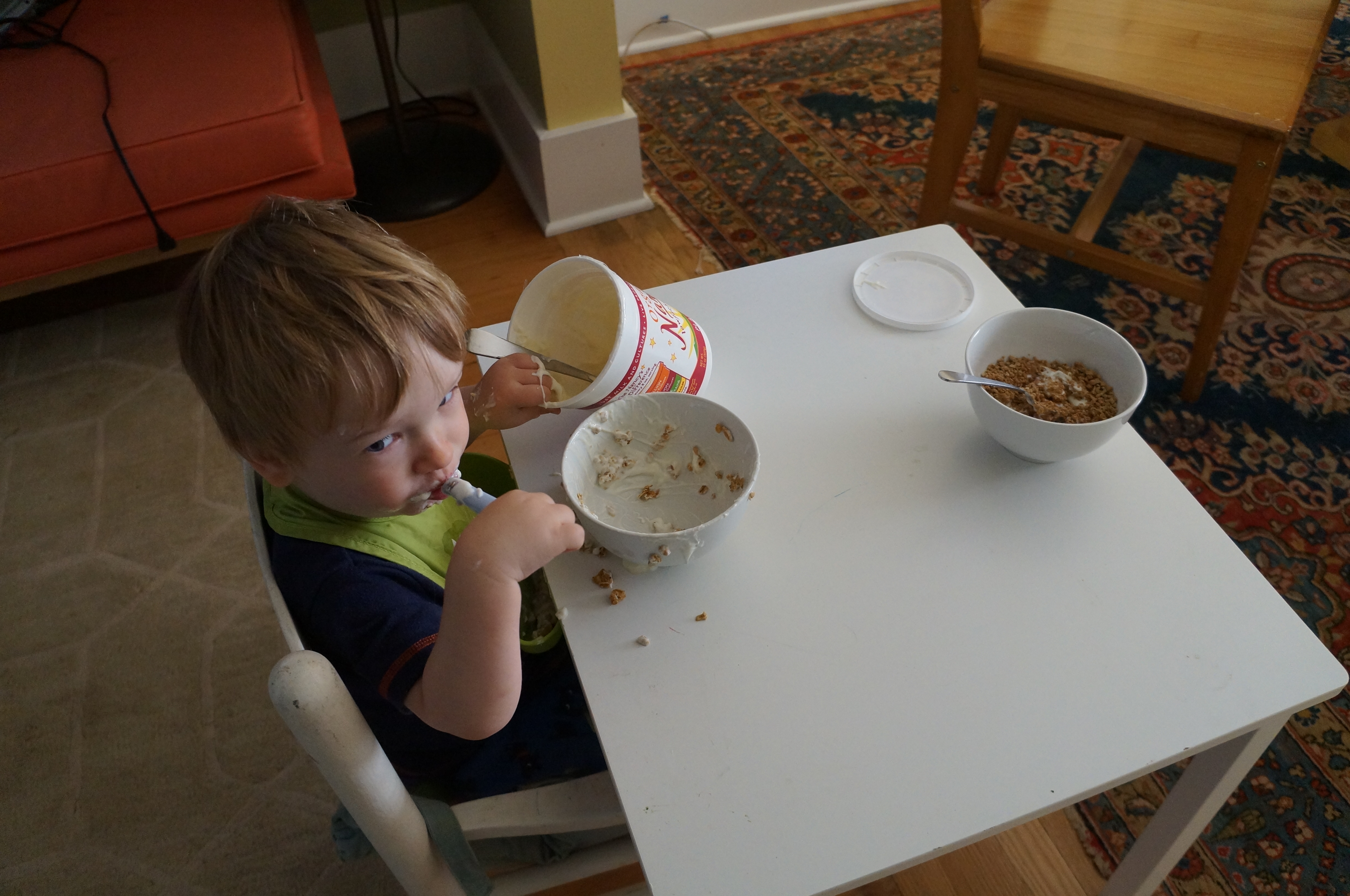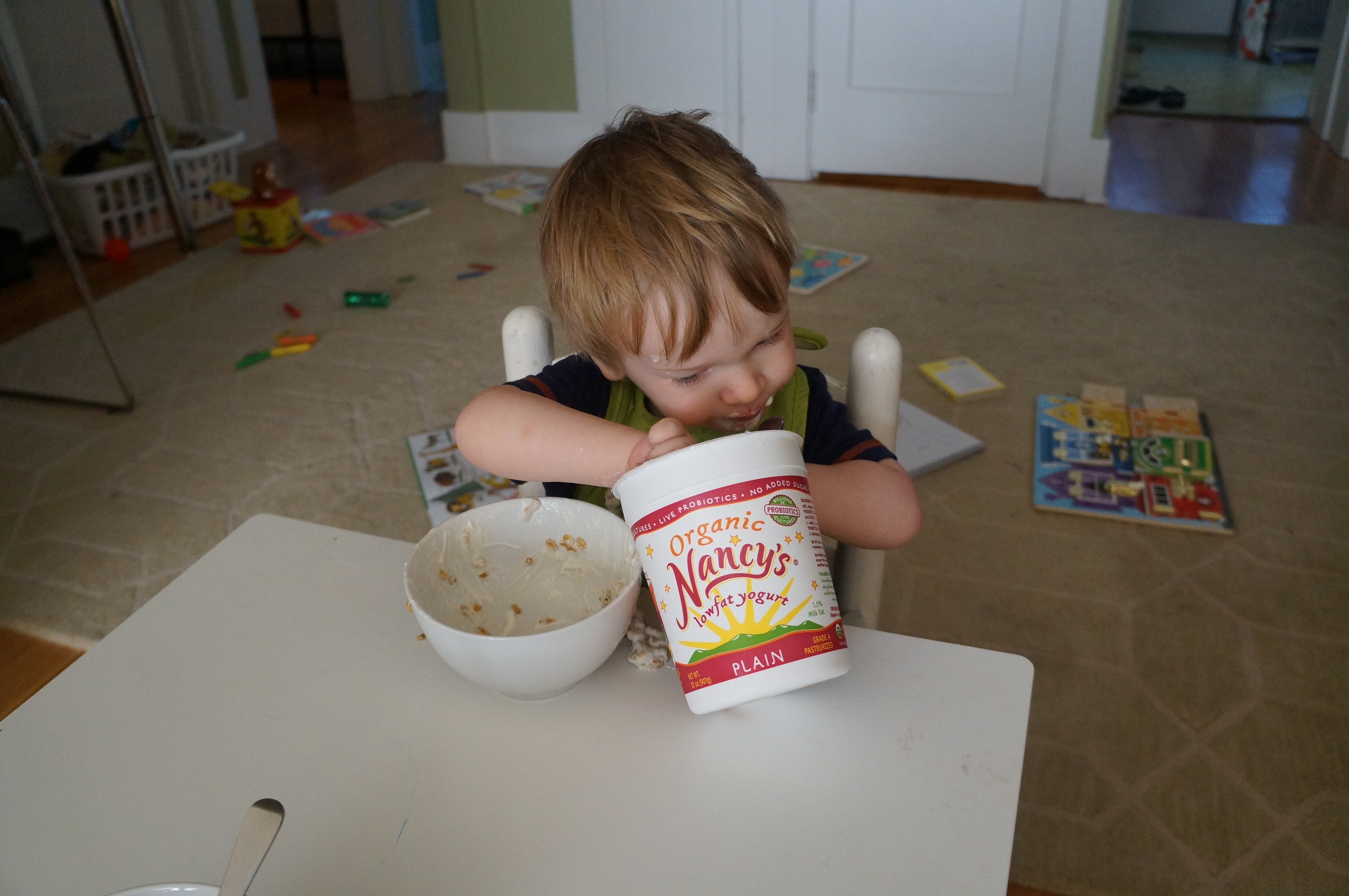 Then I had a day home with Ari. He polished off the yogurt. I heard him calling for “more” and didn’t get there fast enough, so I found him helping himself: