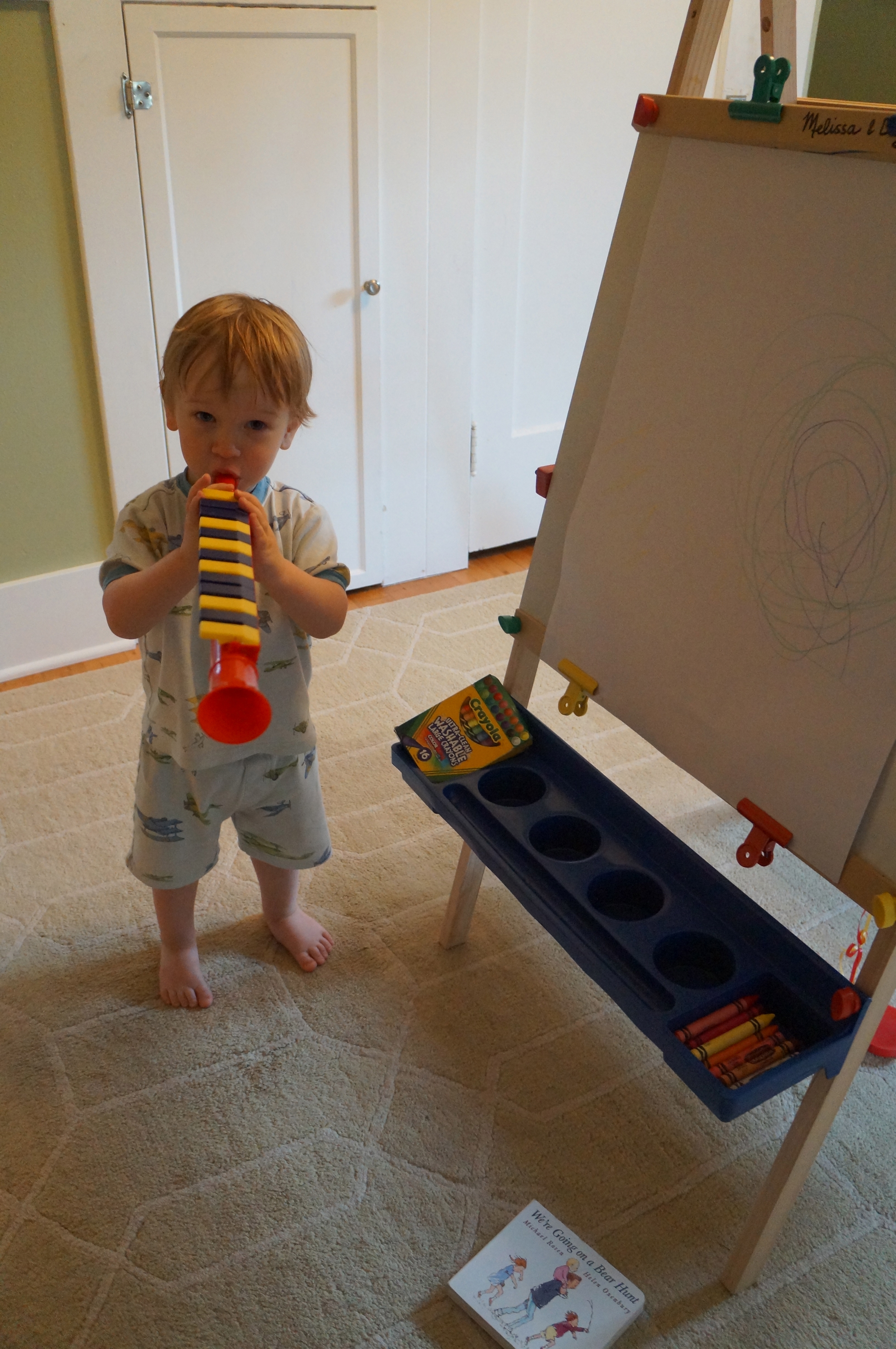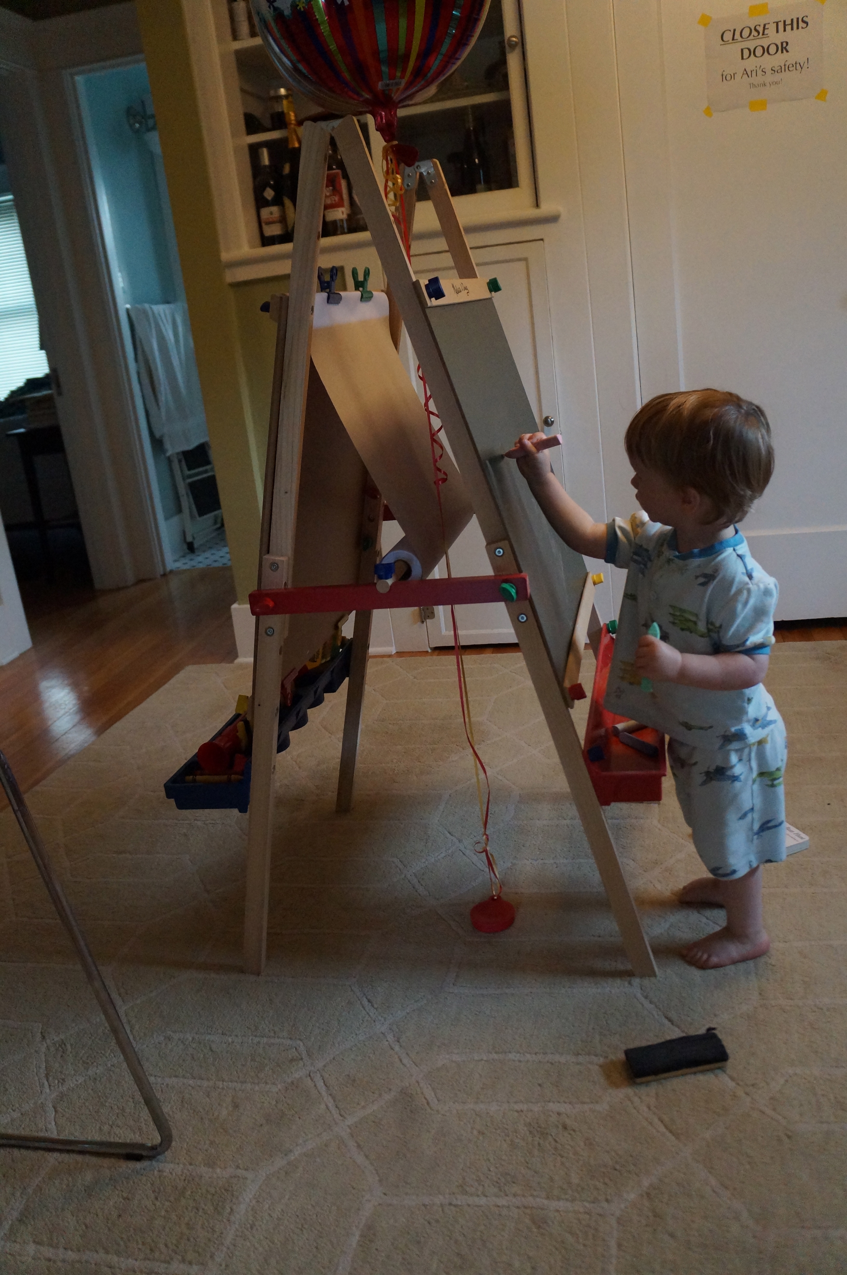 We set up his new easel in our office area, for lack of a better place. He goes and colors on it all the time!